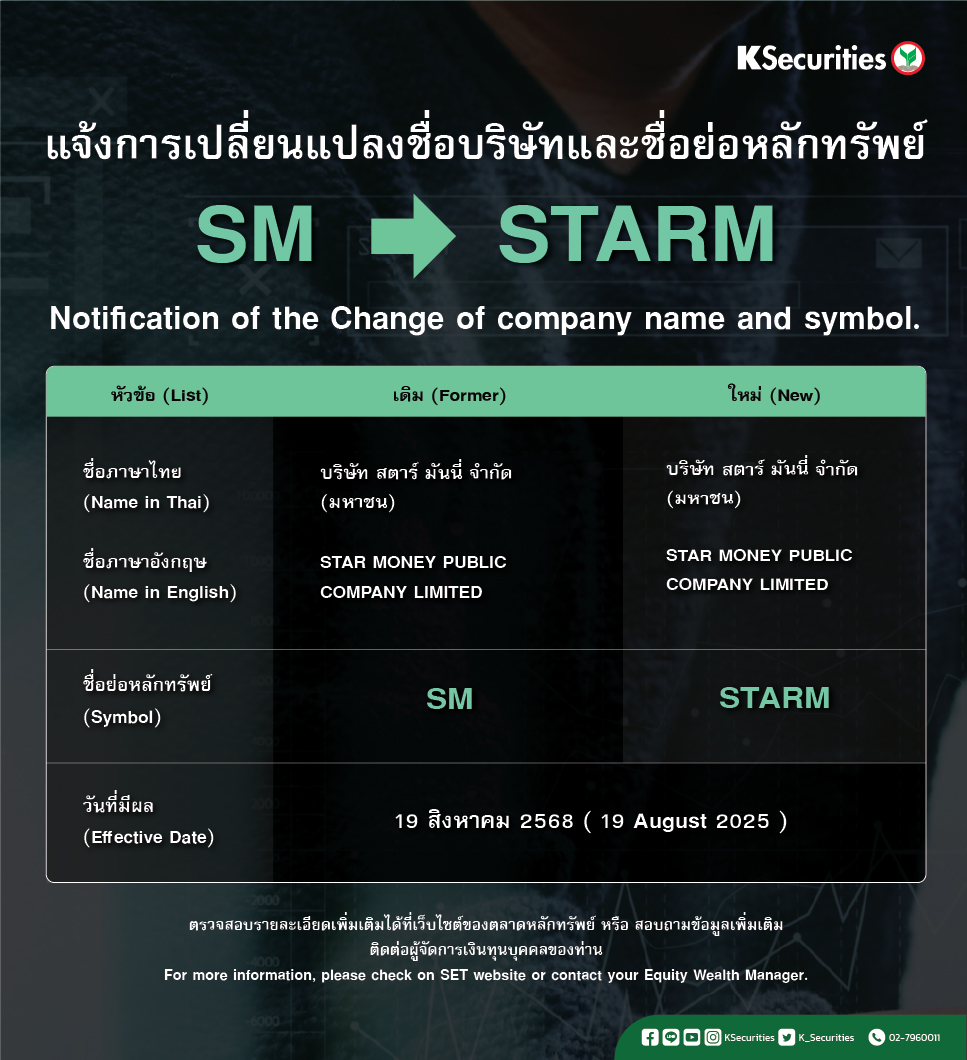 แจ้งการเปลี่ยนแปลงชื่อย่อหลักทรัพย์ของ “SM” เป็น“STARM” วันที่มีผล วันที่ 19 สิงหาคม 2568