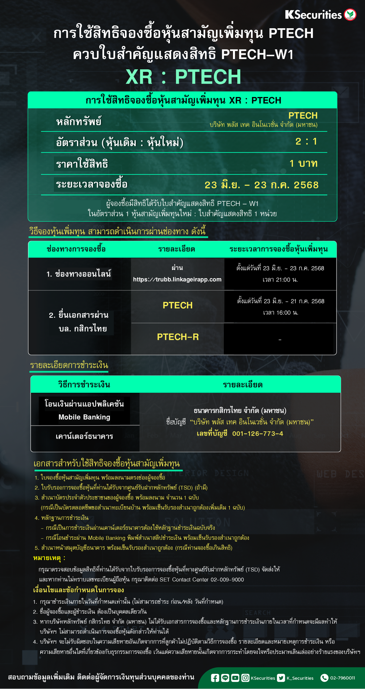 ศึกษาคู่มือการจองซื้อหุ้นสามัญเพิ่มทุน แบบฟอร์ม และ Bill Payment PTECH คลิกที่นี่