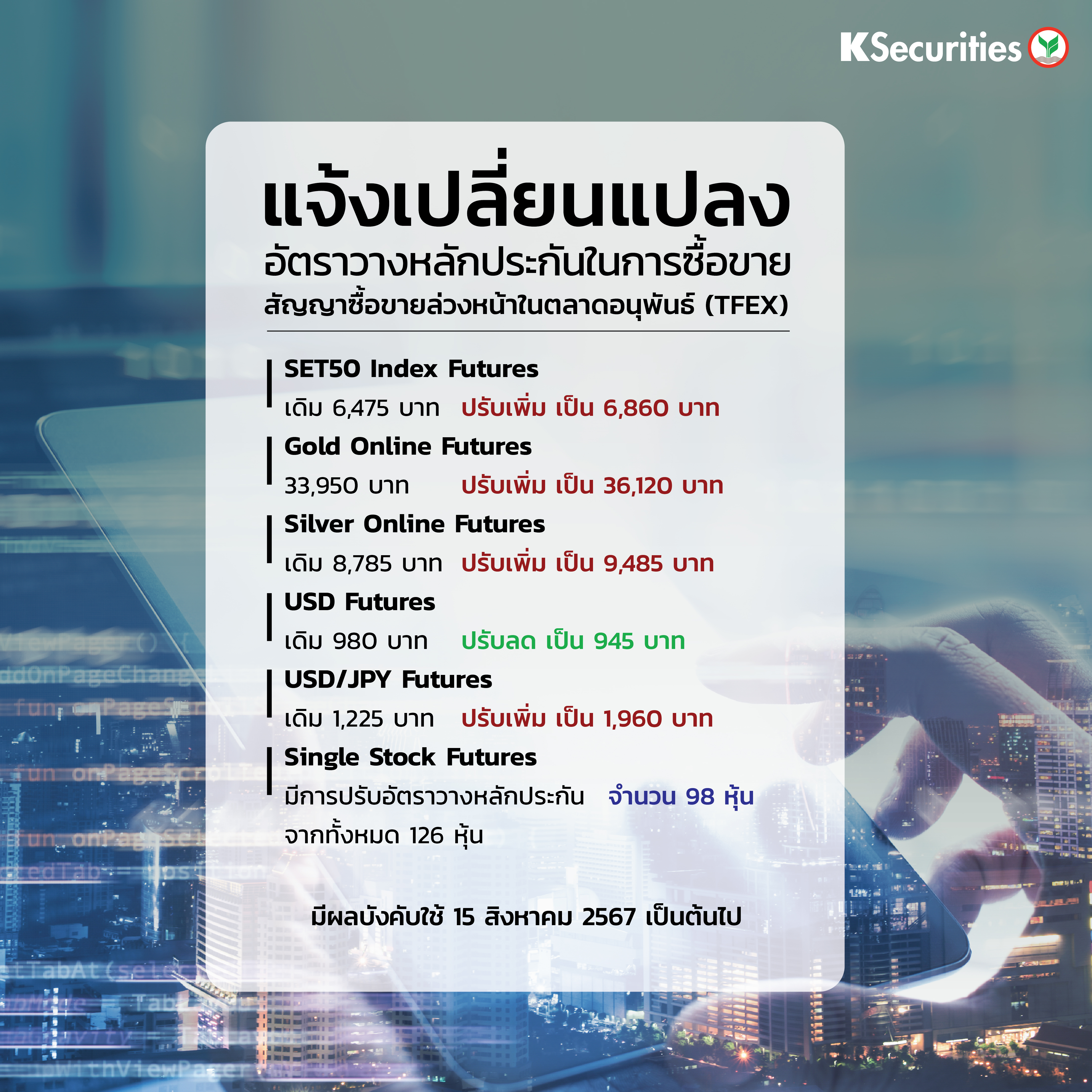 TH Version แจ้งการเปลี่ยนแปลงอัตราวางหลักประกันในการซื้อขายสัญญาซื้อขายล่วงหน้าในตลาดTFEX