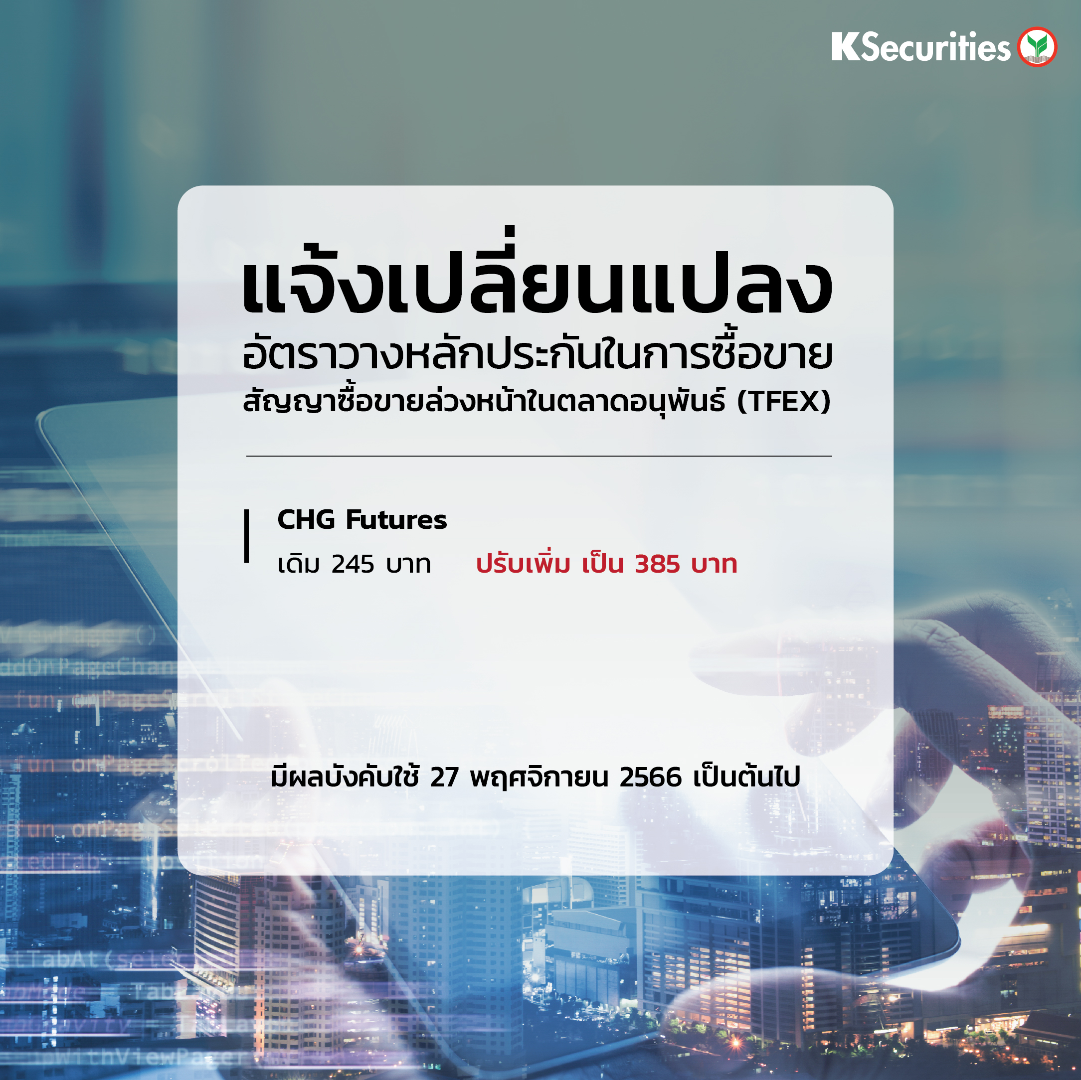 EN Version แจ้งเปลี่ยนแปลงอัตราวางหลักประกันในการซื้อขายสัญญาซื้อขายล่วงหน้าในตลาด TFEX