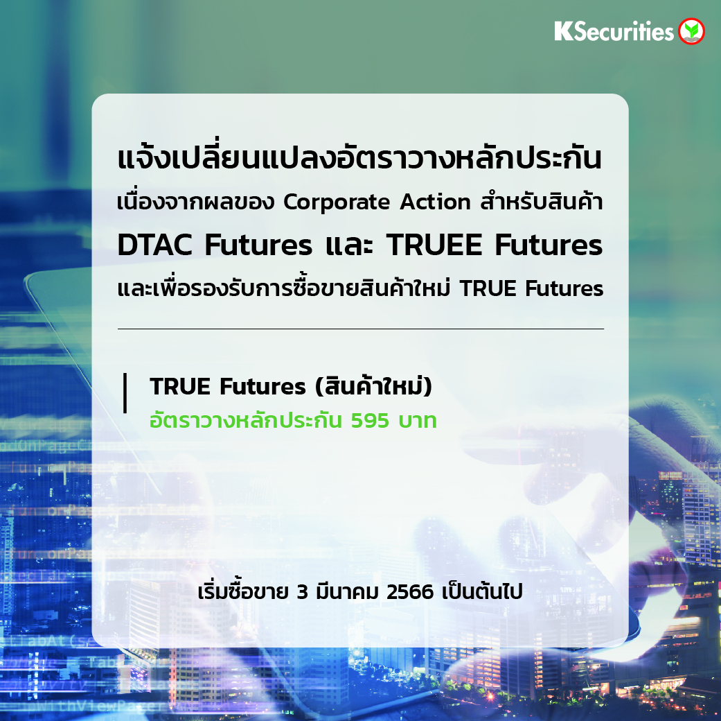 แจ้งเปลี่ยนแปลงอัตราวางหลักประกันเนื่องจากผลของ Corporate Action สำหรับสินค้า DTAC Futures และ TRUEE Futures และเพื่อรองรับการซื้อขายสินค้าใหม่ TRUE Futures