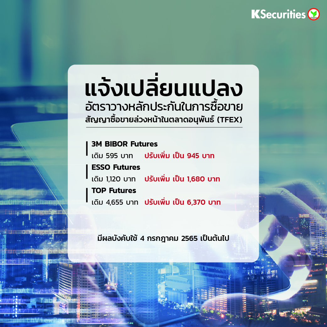 แจ้งเปลี่ยนแปลงอัตราวางหลักประกันในการซื้อขายสัญญาซื้อขายล่วงหน้าในตลาด TFEX