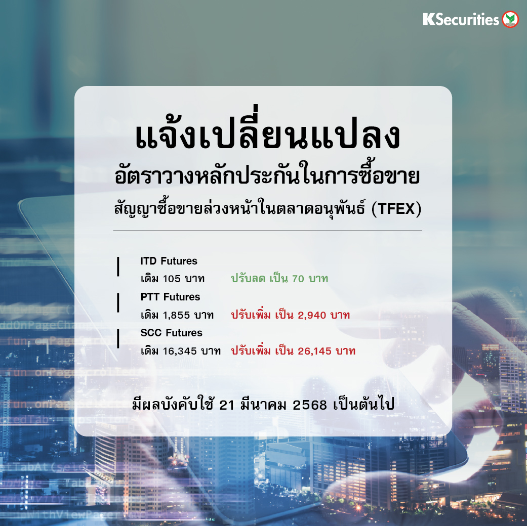 EN Version แจ้งเปลี่ยนแปลงอัตราวางหลักประกันในการซื้อขายสัญญาซื้อขายล่วงหน้าในตลาด TFEX