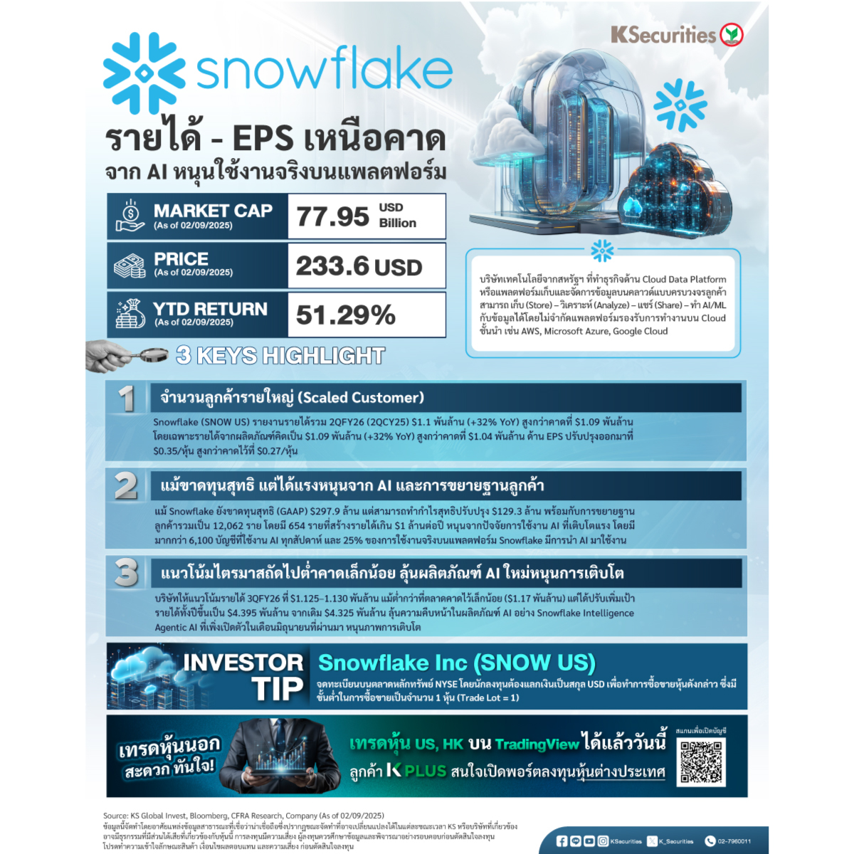 บริษัทให้แนวโน้มรายได้ 3QFY26 ที่ $1.125–1.130 พันล้าน แม้ต่ำกว่าที่ตลาดคาดไว้เล็กน้อย ($1.17 พันล้าน) แต่ได้ปรับเพิ่มเป้ารายได้ทั้งปีขึ้นเป็น $4.395 พันล้าน จากเดิม $4.325 พันล้าน ลุ้นความคืบหน้าในผลิตภัณฑ์ AI อย่าง Snowflake Intelligence Agentic AI ที่เพิ่งเปิดตัวในเดือนมิถุนายนที่ผ่านมา หนุนภาพการเติบโต
