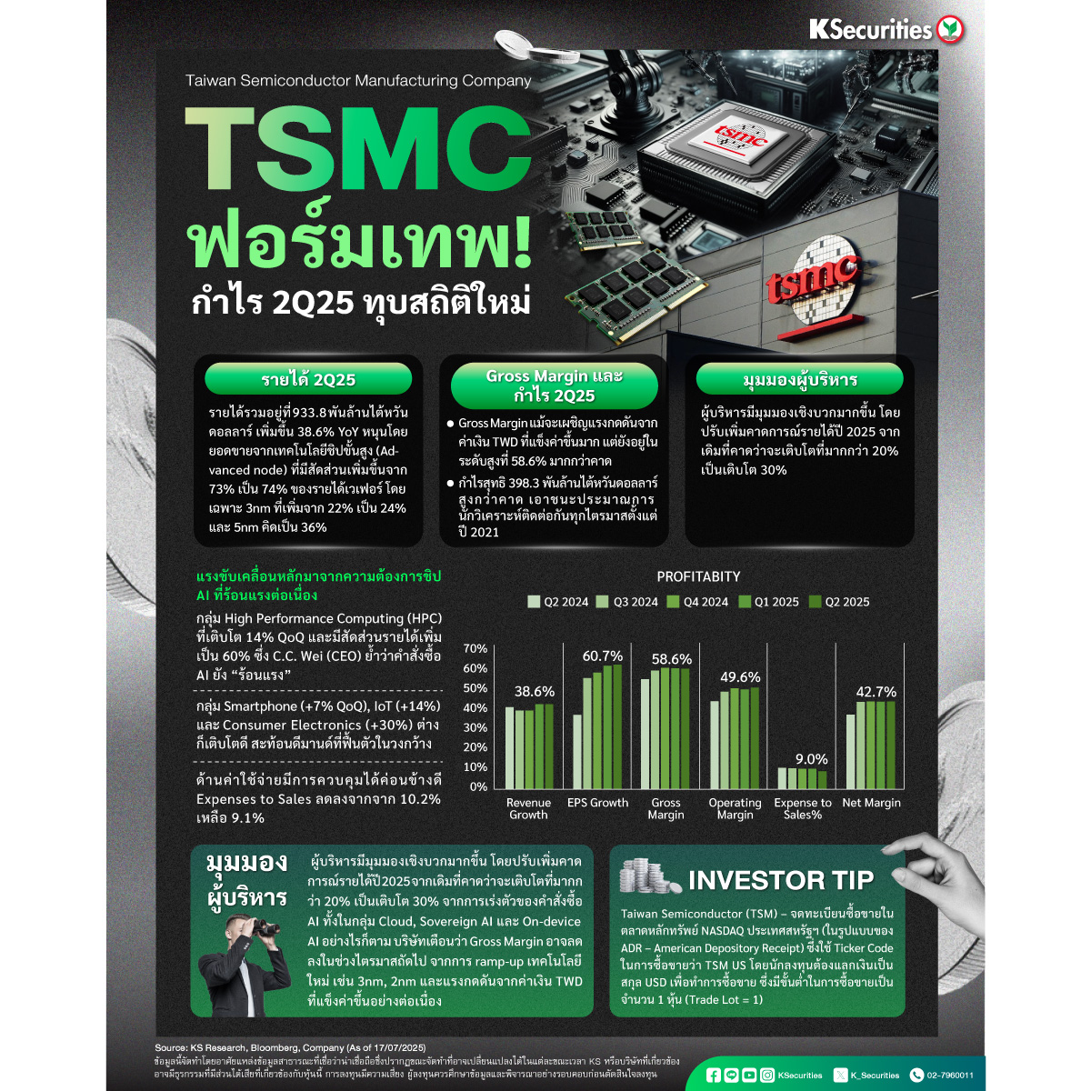 - TSMC รายงานกำไร 2Q25 พุ่ง 61% แตะระดับสูงสุดเป็นประวัติการณ์