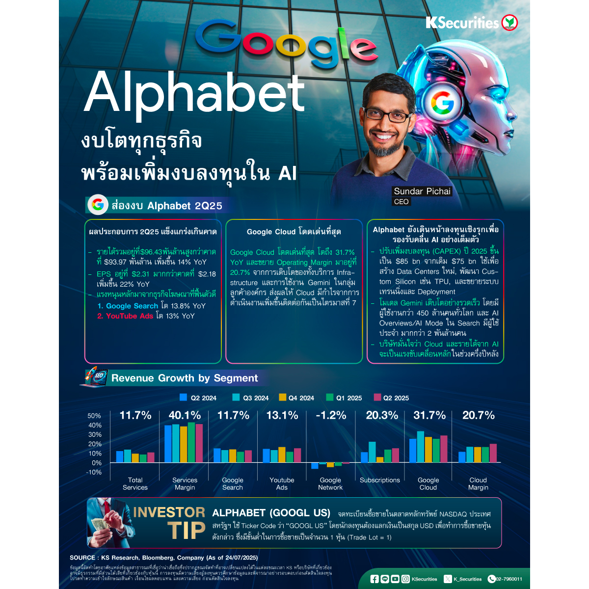 จากการเร่งขยายทีม AI โดยเฉพาะด้าน Gemini และ AI Infrastructure, การส่งเสริมการใช้งาน Search และ YouTube Ads ท่ามกลางการแข่งขันด้านโฆษณา และ Legal cost จากคดีความด้าน Antitrust ที่ยังอยู่ระหว่างดำเนินการ นอกจากนี้ ยังมีสัญญาณชะลอตัวในฝั่ง Ad spending จากลูกค้าเอเชีย โดยเฉพาะจีน ซึ่งได้รับผลกระทบจากมาตรการ Tariffs - Alphabet ยังเดินหน้าลงทุนเชิงรุกเพื่อรองรับคลื่น AI อย่างเต็มตัว