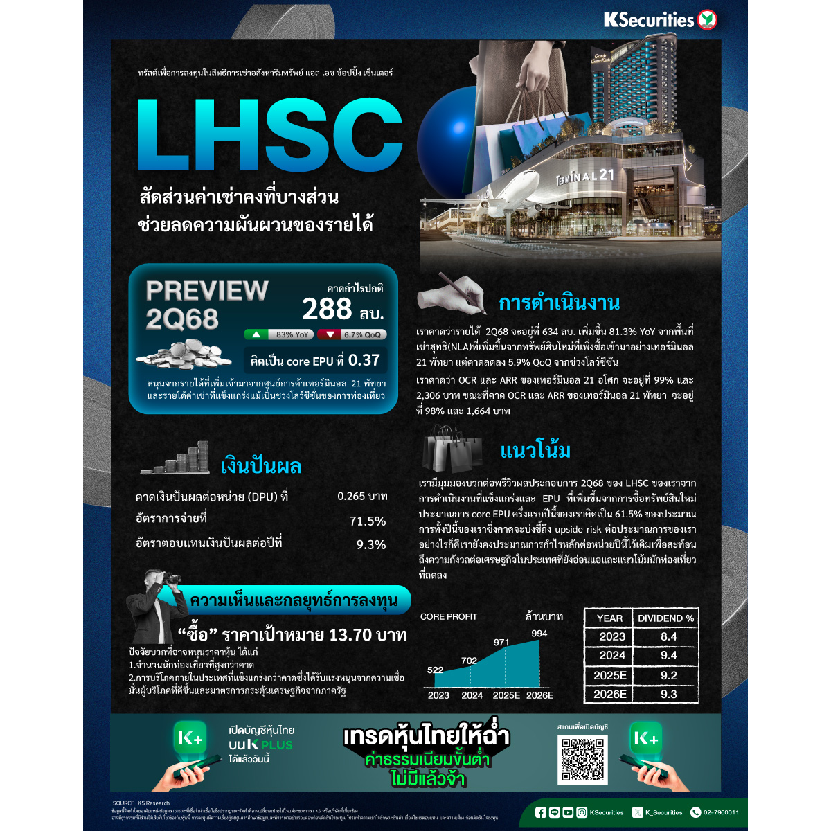 • แนะนำ “ซื้อ” LHSC และปรับปีฐานราคาเป้าหมายไปเป็นกลางปี 2569 ที่ 13.70 บาท หรือคิดเป็น market IRR ที่ 8.48% และ WALE ที่ 19.0 ปี