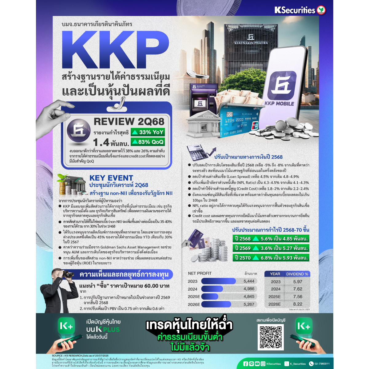 • KKP ปรับเป้าหมายทางการเงินปี 68 โดยลดเป้าการเติบโตของสินเชื่อและส่วนต่าง แต่แนวโน้ม credit cost ที่ดีขึ้นน่าจะช่วยชดเชยแนวโน้มรายได้ที่อ่อนแอในครึ่งหลังของปี 68 ได้