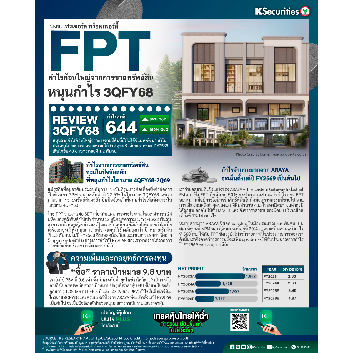 - คงคำแนะนำ “ซื้อ” ปรับเพิ่ม TP ขึ้นเป็น 9.8 บาท (จาก 9.6 บาท) หลังปรับปีฐาน TP ไปเป็นกลางปี 69 กำไรไตรมาส 4QFY68 และปี FY69 ที่แข็งแกร่ง หนุนจากการขายทรัพย์สินและ ARAYA จะเป็นปัจจัยหลักที่ช่วยหนุนราคาหุ้น