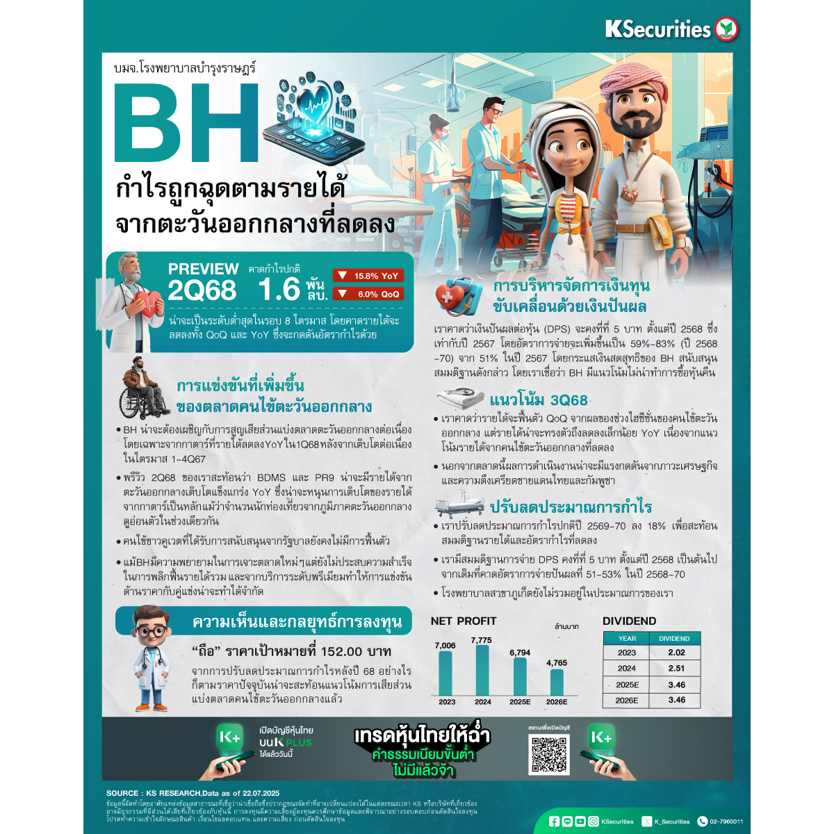 • เราคาดกำไรปกติไตรมาส 2/68 ของ BH จะลดลงทั้ง QoQ และ YoY มาอยู่ที่ 1.6 พันลบ. ซึ่งน่าจะเป็นระดับต่ำสุดในรอบ 8 ไตรมาส โดยคาดรายได้จะลดลงทั้ง QoQ และ YoY ซึ่งจะกดดันอัตรากำไรด้วย
