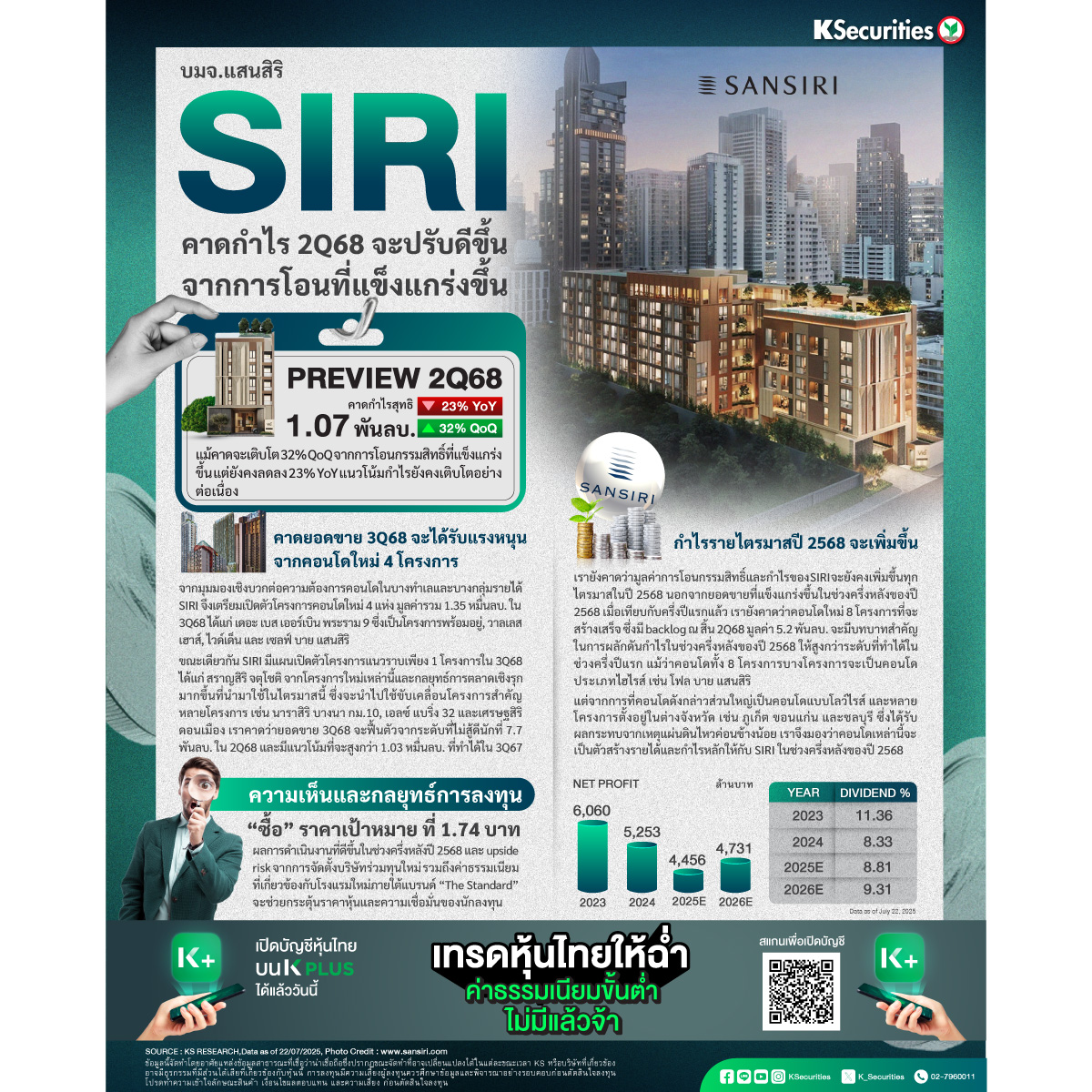 SIRI : คาดกำไร 2Q68 จะปรับดีขึ้นจากการโอนที่แข็งแกร่งขึ้น