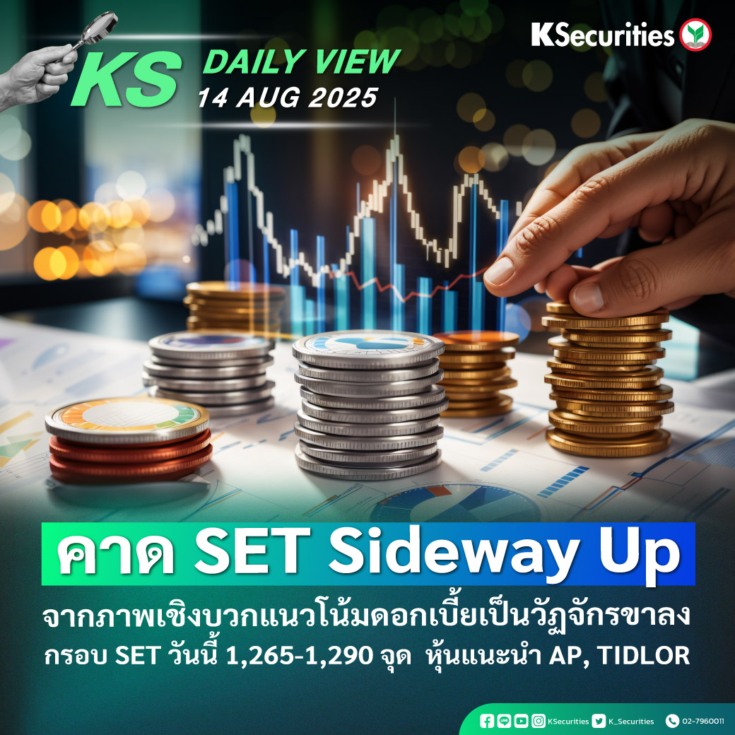 KS Daily View 14 ส.ค. 2025>>> คาด SET Index แกว่งตัว sideway up ในกรอบ 1,265-1,290 จุด จากภาพเชิงบวกของแนวโน้มอัตราดอกเบี้ยเป็นวัฏจักรขาลงหลัง กนง. มีมติเป็นเอกฉันท์ให้ปรับลดอัตราดอกเบี้ยนโยบายลง 25bps แนะนำ AP และ TIDLOR