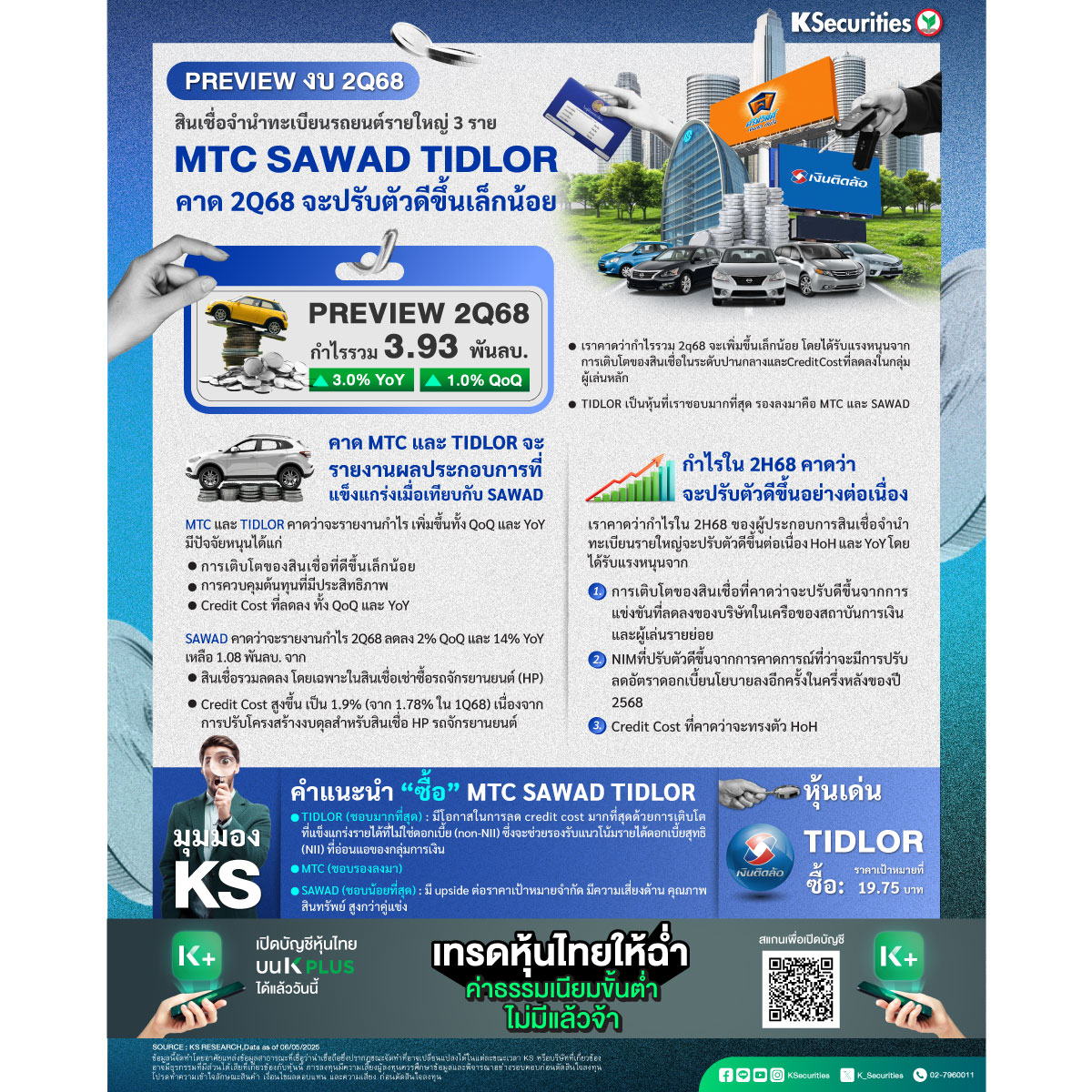 • คาด MTC และ TIDLOR จะรายงานผลประกอบการที่แข็งแกร่งเมื่อเทียบกับ SAWAD ในบรรดาผู้ประกอบการสินเชื่อจำนำทะเบียนรถยนต์ชั้นนำ เราคาดว่า MTC และ TIDLOR จะรายงานผลประกอบการที่แข็งแกร่งขึ้นด้วยการเติบโตของกำไรทั้ง QoQ และ YoY ขณะที่เราคาดว่า SAWAD จะรายงานกำไรที่ลดลงเล็กน้อยทั้ง QoQ และ YoY เราคาดว่า MTC และ TIDLOR จะมีปัจจัยขับเคลื่อนกำไรที่คล้ายคลึงกัน ได้แก่ การเติบโตของสินเชื่อที่ดีขึ้นเล็กน้อยในไตรมาส 2/2568 การควบคุมต้นทุนที่ดี และ credit cost ที่ลดลงทั้ง QoQ และ YoY ในขณะเดียวกัน เราคาดว่า SAWAD จะรายงานกำไรไตรมาส 2/2568 ลดลง 2% QoQ และ 14% YoY เป็น 1.08 พันลบ. จากสินเชื่อรวมที่ลดลง ซึ่งส่วนใหญ่มาจากสินเชื่อเช่าซื้อ (HP) รถจักรยานยนต์ และ credit cost ที่สูงขึ้นเป็น 1.9% เทียบกับ 1.78% ในไตรมาส 1/2568 จากการปรับโครงสร้างงบดุลสำหรับสินเชื่อ HP รถจักรยานยนต์