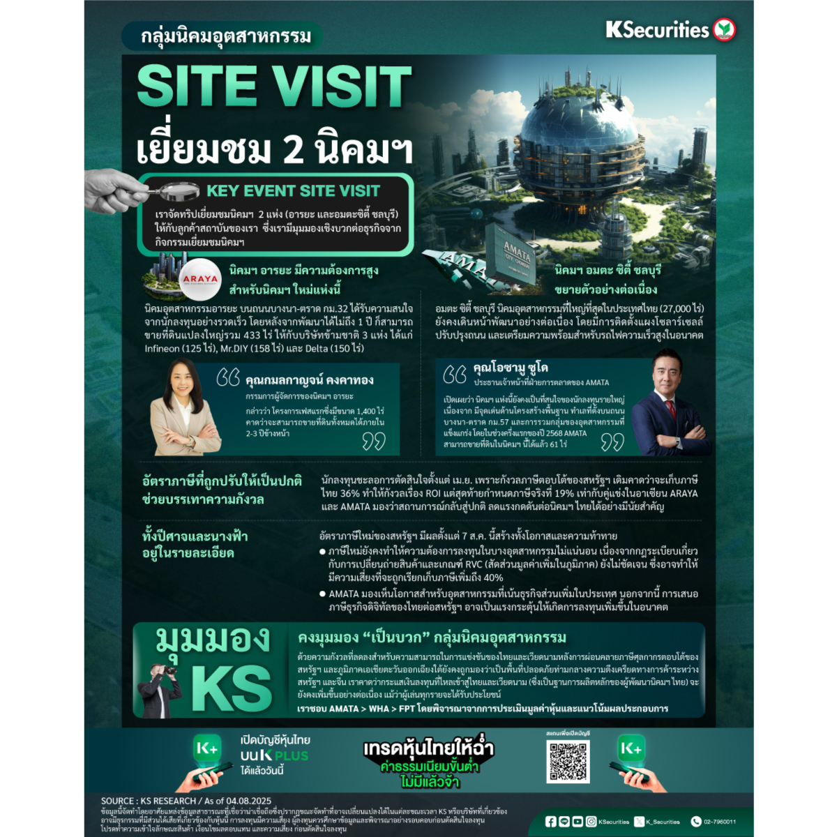 • อัตราภาษีที่ถูกปรับให้เป็นปกติช่วยบรรเทาความกังวล นักลงทุนที่มีศักยภาพส่วนใหญ่ใช้แนวทาง “wait-and-see” มาตั้งแต่เดือน เม.ย. หลังมีการกำหนดภาษีศุลกากรตอบโต้ของสหรัฐฯ ในอัตรา 36% ต่อไทย ก่อให้เกิดความกังวลอย่างมากเกี่ยวกับ ROI อย่างไรก็ตาม ด้วยอัตราภาษีสุดท้ายเมื่อวันศุกร์ที่ผ่านมาที่ 19% ซึ่งเท่ากับคู่แข่งสำคัญ (19% สำหรับอินโดนีเซีย มาเลเซีย ฟิลิปปินส์ กัมพูชา และ 20% สำหรับเวียดนาม) ARAYA และ AMATA เชื่อว่าสถานการณ์อุตสาหกรรมได้กลับสู่ภาวะปกติแล้ว ช่วยลดแรงกดดันต่อนิคมฯ ของไทย