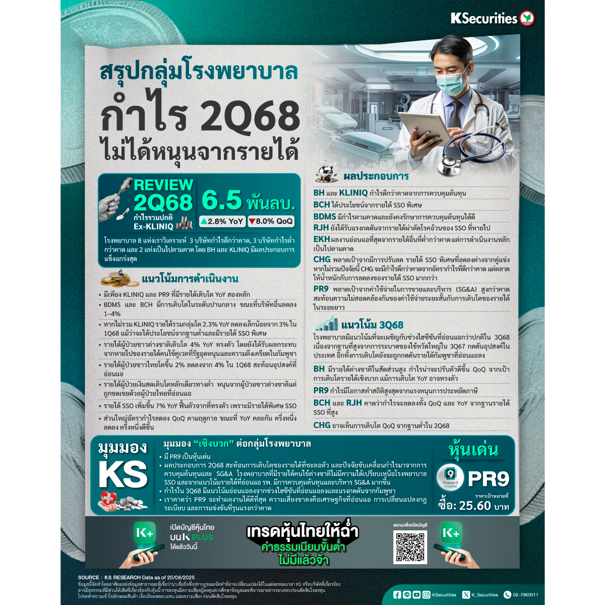 • เรามีมุมมองเชิงบวกต่อกลุ่มโรงพยาบาล โดยมี PR9 เป็นหุ้นเด่น ผลประกอบการไตรมาส 2/2568 สะท้อนการเติบโตของรายได้ที่ชะลอตัว และปัจจัยขับเคลื่อนกำไรมาจากการควบคุมต้นทุนและ SG&A โรงพยาบาลที่มีรายได้คนไข้ต่างชาติไม่มีความได้เปรียบเหนือโรงพยาบาล SSO   จากแนวโน้มรายได้ที่อ่อนแอ รพ. มีการควบคุมต้นทุนและบริหาร SG&A มากขึ้น กำไรในไตรมาส 3/2568 มีแนวโน้มอ่อนแอลงจากช่วงไฮซีซันที่อ่อนแอลงและแรงกดดันจากกัมพูชา เราคาดว่า PR9 จะทำผลงานได้ดีที่สุด ความเสี่ยงขาลงคือเศรษฐกิจที่อ่อนแอ การเปลี่ยนแปลงกฎระเบียบ และการแข่งขันที่รุนแรงกว่าคาด