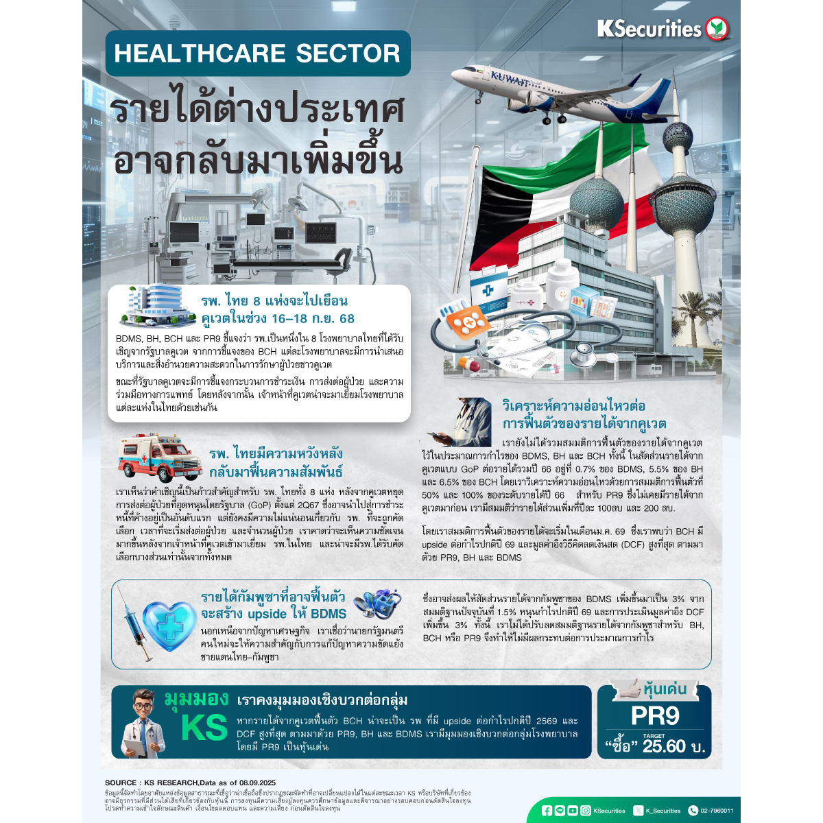 มุมมอง KS : การไปเยือนคูเวตของ รพ ไทย ที่กำลังจะเกิดขึ้น และการมีรัฐบาลใหม่ของไทยถือเป็นปัจจัยที่จะสร้างบรรยากาศการลงทุนเชิงบวกต่อโรงพยาบาลที่ให้บริการผู้ป่วยต่างชาติ โดยการฟื้นตัวของรายได้จากคูเวตจะทำให้ BCH มีความเสี่ยงขาขึ้นต่อกำไรปกติปี 2569 และการประเมินมูลค่า DCF สูงที่สุด ตามมาด้วย PR9, BH และ BDMS ส่วนการฟื้นตัวของรายได้จากกัมพูชา มีเพียง BDMS ที่มีความเสี่ยงขาขึ้น โดยรวมแล้ว เรามีมุมมองเชิงบวกต่อกลุ่มโรงพยาบาล โดยมี PR9 เป็นหุ้นเด่น ความเสี่ยงขาลงของกลุ่ม รพ. คือเศรษฐกิจที่อ่อนแอ การเปลี่ยนแปลงด้านกฎระเบียบ และการแข่งขันที่รุนแรงกว่าคาด
