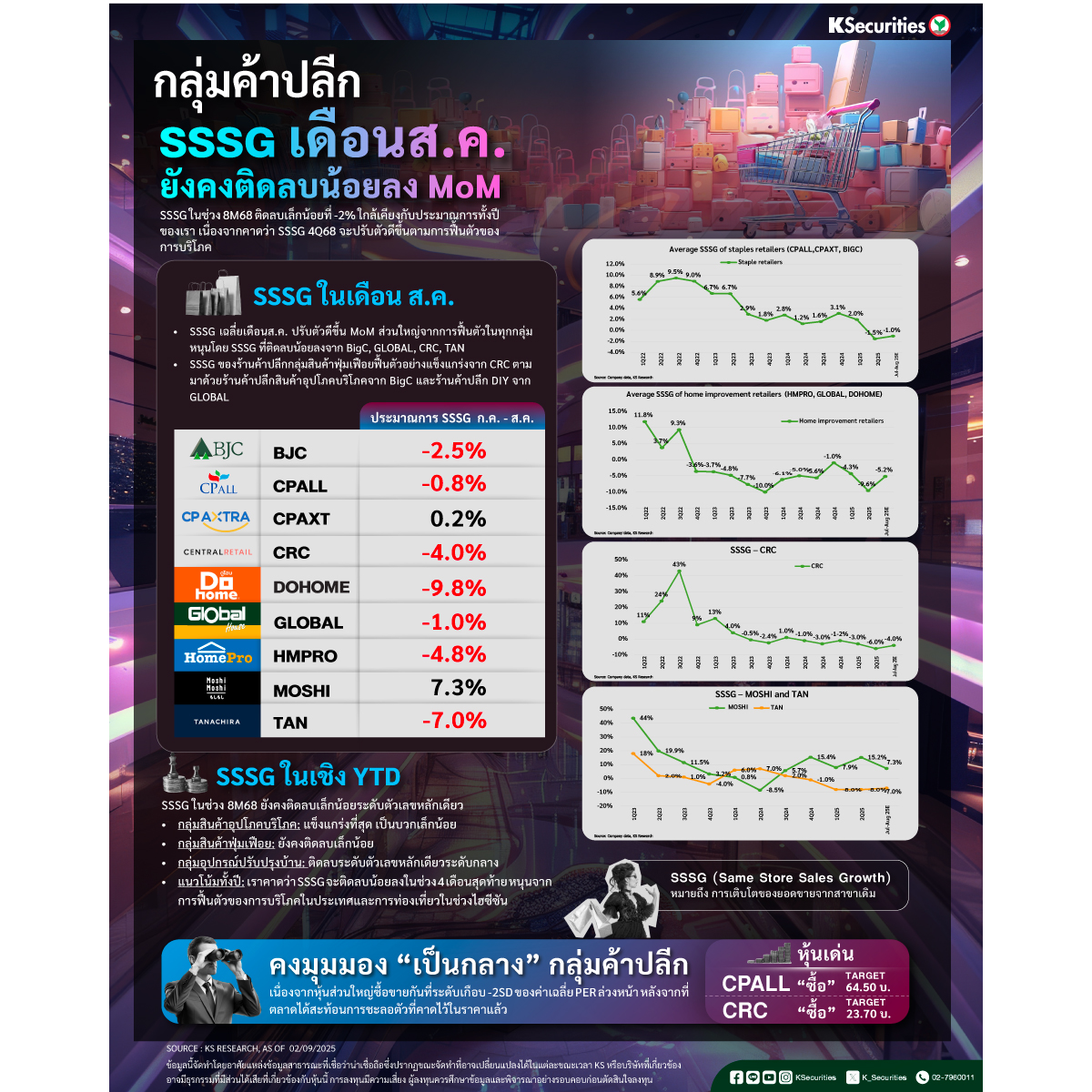 SSSG ของร้านค้าปลีกสินค้าอุปโภคบริโภค น่าจะติดลบน้อยลงจากเดือน ก.ค. หลักๆ จาก SSSG ของ BigC ที่ลบน้อยลง ขณะที่ SSSG ของธุรกิจ B2B ของ CPAXT น่าจะทรงตัว และ B2C อาจออกมาเป็นบวกเล็กน้อย หนุนจากผลกระทบเชิงลบจากสภาพอากาศ และความไม่สงบชายแดนที่ลดลง ส่วน SSSG ของ CPALL คาดว่าจะยังอยู่ราว -<1% ทรงตัว MoM ท่ามกลางการท่องเที่ยวที่ชะลอตัวจากฐานสูงในปีที่แล้ว โดยมีผลกระทบจากวันสารทจีนที่เลื่อนจากเดือนส.ค. 2567 มาเป็นก.ย. 2568
