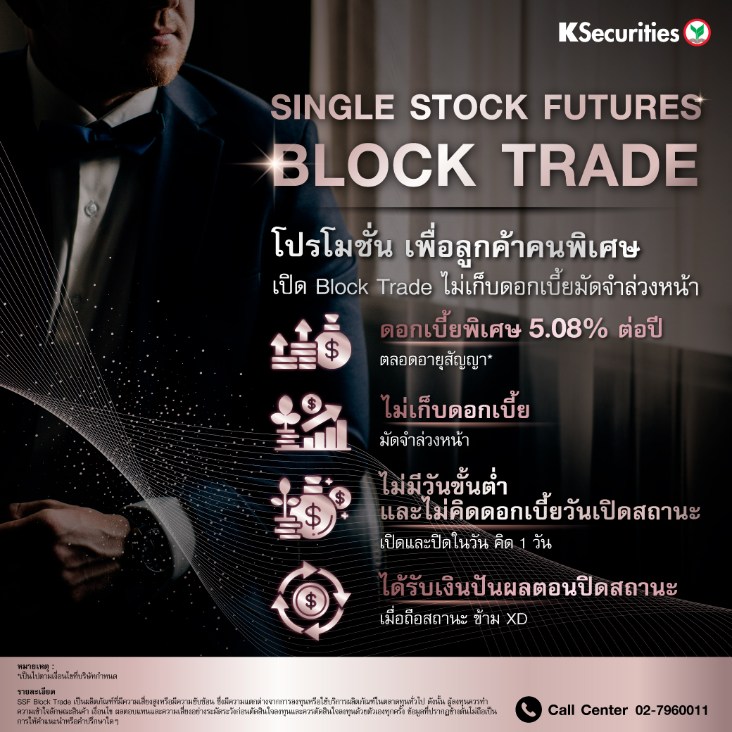 SSF Block Trade เป็นผลิตภัณฑ์ที่มีความเสี่ยงสูงหรือมีความซับซ้อน ซึ่งมีความแตกต่างจากการลงทุนหรือใช้บริการผลิตภัณฑ์ในตลาดทุนทั่วไป ดังนั้น ผู้ลงทุนควรทําความเข้าใจลักษณะสินค้า เงื่อนไข ผลตอบแทนและความเสี่ยงอย่างระมัดระวังก่อนตัดสินใจลงทุนและควรตัดสินใจลงทุนด้วยตัวเองทุกครั้ง ข้อมูลที่ปรากฏข้างต้นไม่ถือเป็นการให้คําแนะนําหรือคําปรึกษาใดๆ