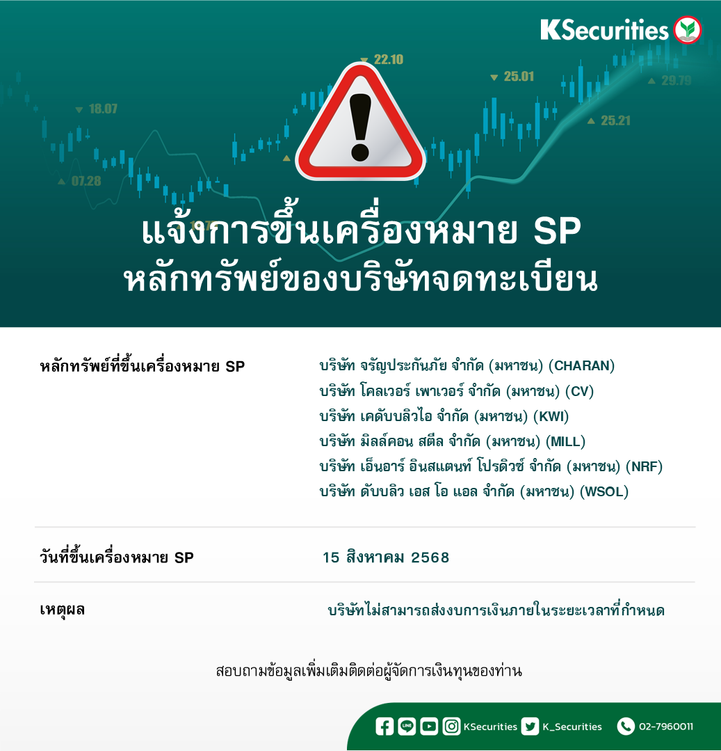 ตลาดหลักทรัพย์ขึ้นเครื่องหมาย SP หลักทรัพย์ของบริษัทจดทะเบียน กรณีไม่ส่งงบการเงินสิ้นสุดวันที่ 30 มิ.ย. 2568
