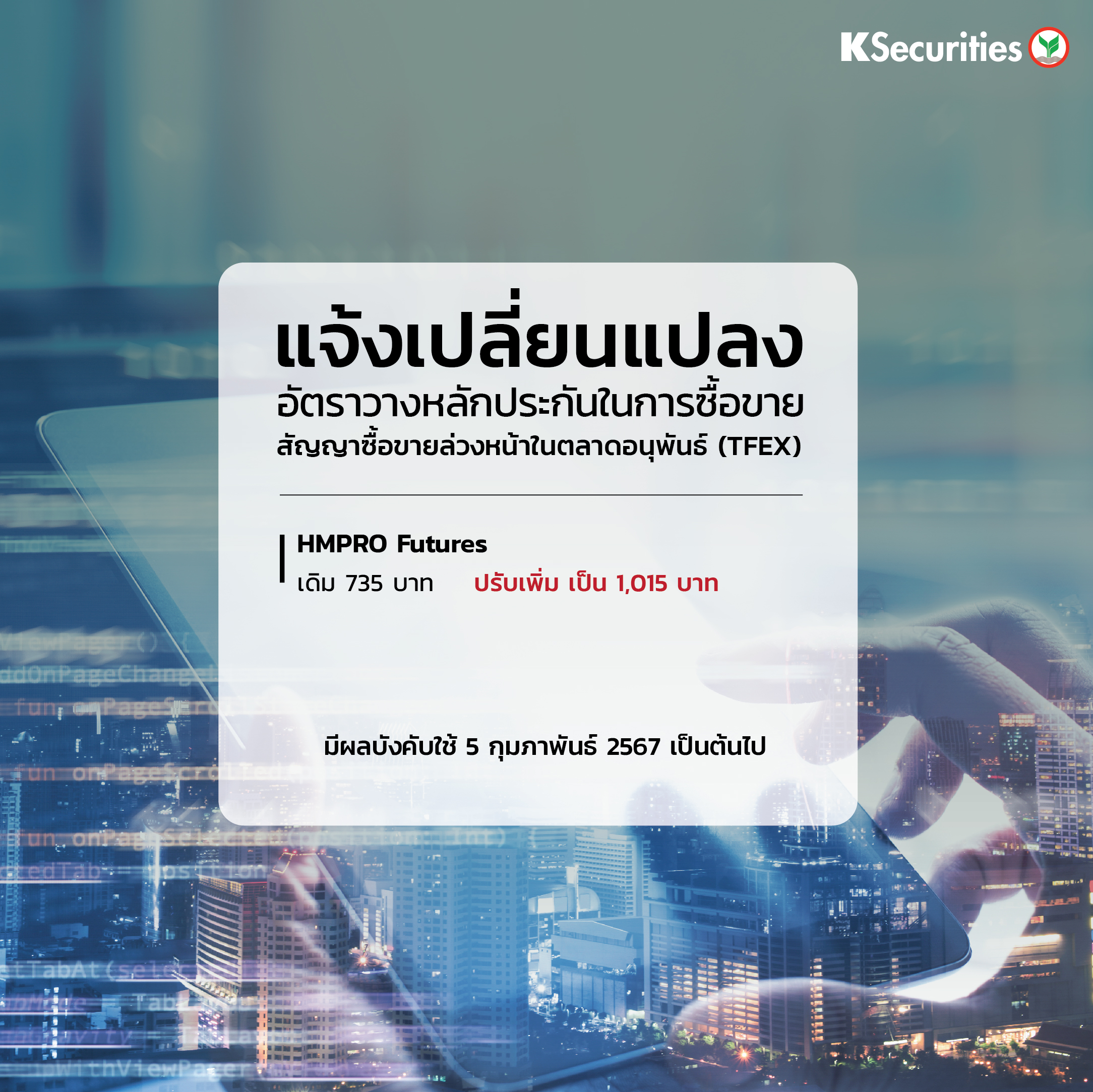EN Version แจ้งเปลี่ยนแปลงอัตราวางหลักประกันในการซื้อขายสัญญาซื้อขายล่วงหน้าในตลาด TFEX