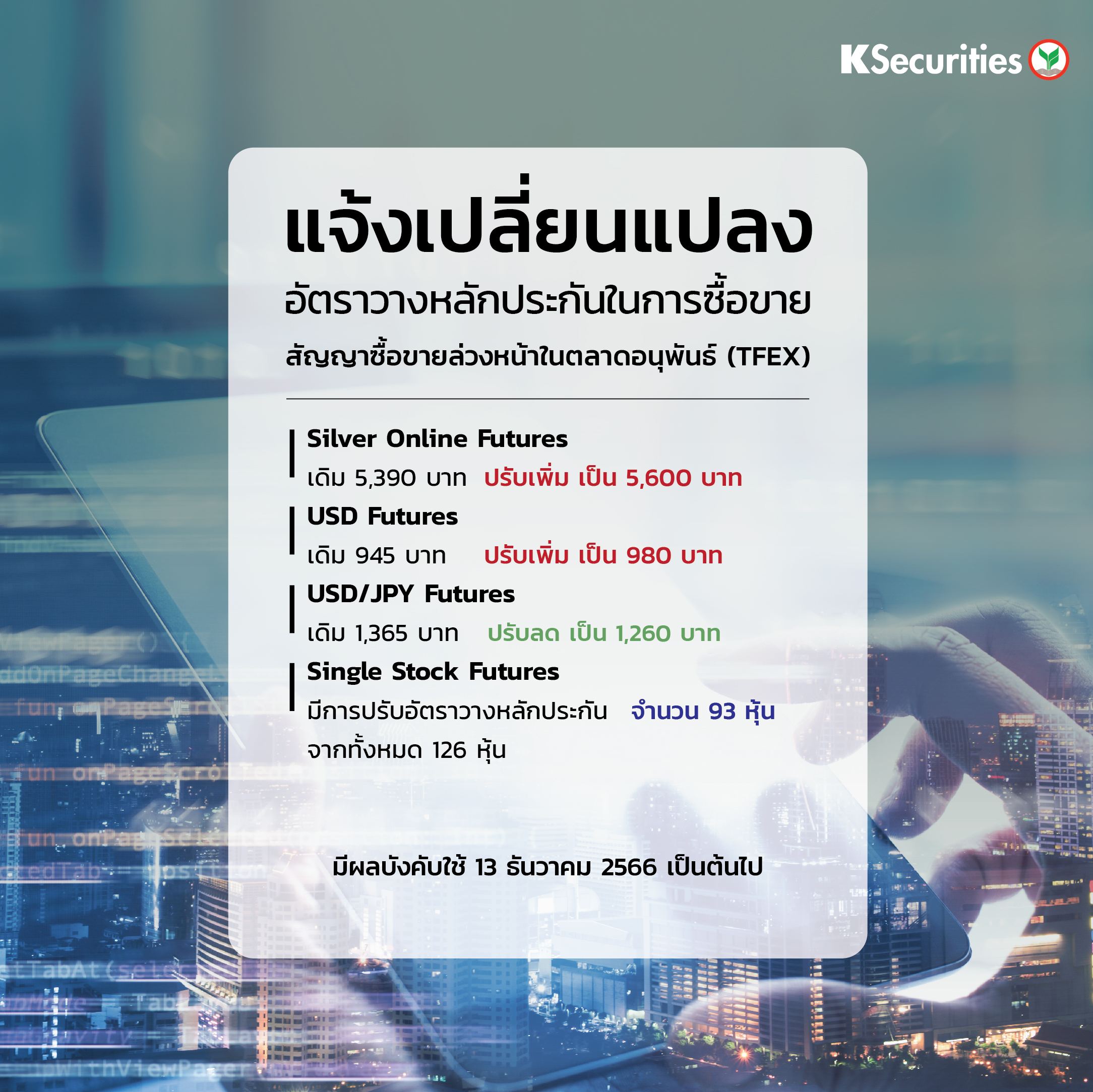 TH Version แจ้งเปลี่ยนแปลงอัตราวางหลักประกันในการซื้อขายสัญญาซื้อขายล่วงหน้าในตลาด TFEX