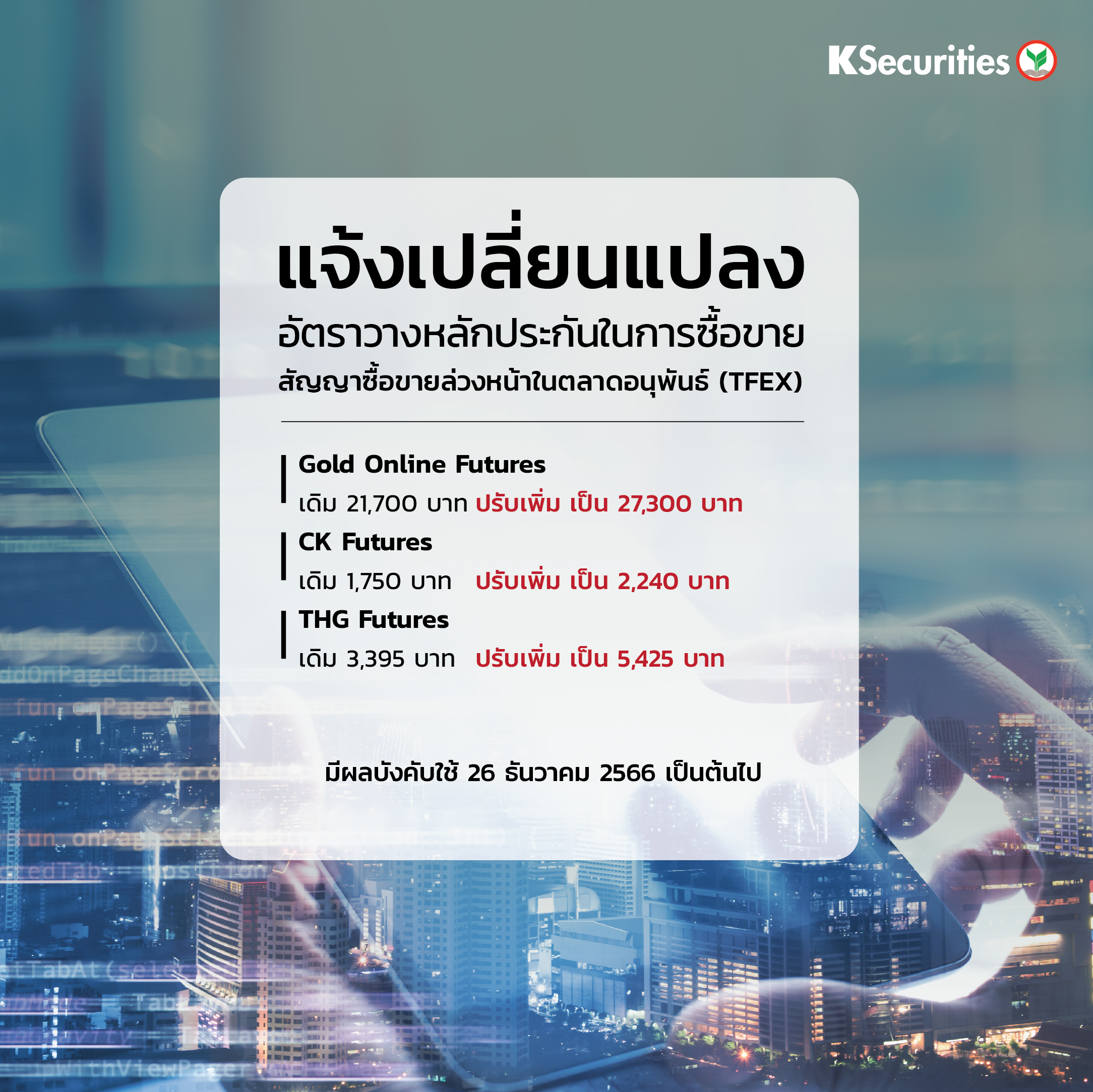 EN Version แจ้งเปลี่ยนแปลงอัตราวางหลักประกันในการซื้อขายสัญญาซื้อขายล่วงหน้าในตลาด TFEX
