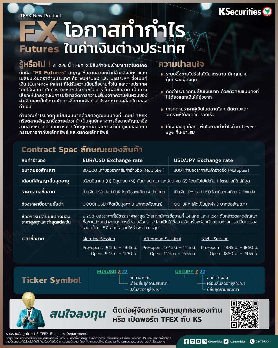 รู้หรือไม่ 31 ต.ค. นี้ TFEX จะมีสินค้าใหม่เข้ามาเทรดในตลาด นั่นคือ FX Futures สัญญาซื้อขายล่วงหน้าที่อ้างอิงอัตราแลกเปลี่ยนเงินตราต่างประเทศ คือ EUR/USD และ USD/JPY ซึ่งเป็นคู่เงิน (Currency Pairs) ที่ได้รับความนิยมซื้อขายทั้งใน และต่างประเทศ โดยใช้เงินบาทในการวางหลักประกันหรือมาร์จิ้นเพื่อซื้อขาย เป็นทางเลือกให้นักลงทุนในการบริหารจัดการความเสี่ยงจากความผันผวนของค่าเงิน และเป็นโอกาสในการซื้อขายเพื่อทำกำไรจากการเคลื่อนไหวของค่าเงิน มีการคำนวณกำไรขาดทุนเป็นเงินบาทด้วยตัวคูณแบบคงที่ โดยมี TFEX หรือตลาดสัญญาซื้อขายล่วงหน้า เป็นศูนย์กลางการซื้อขายสัญญาซื้อขายล่วงหน้าที่ดำเนินการภายใต้กฏเกณฑ์ และการกำกับดูแลของคณะกรรมการกำกับหลักทรัพย์ และตลาดหลักทรัพย์