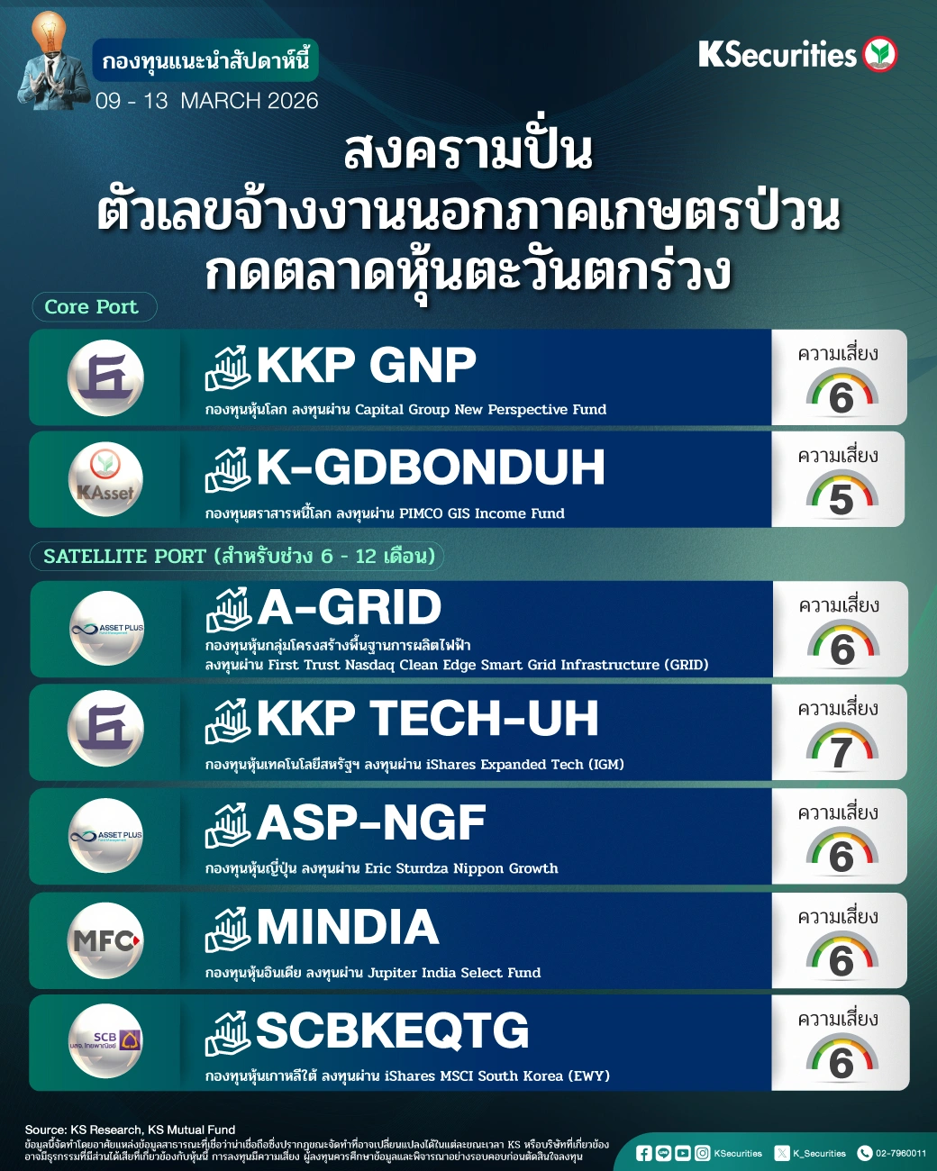 🏗️เรายังคงแนะนำให้อาศัยจังหวะตลาดปรับตัวลดลง ทยอยสะสมหุ้นโลก KKP GNP เป็น Core Equity Portfolio ควบคู่กับตราสารหนี้โลก K-GDBONDUH เป็น Core Fixed Income Portfolio ในช่วงที่ 10Y UST ยังเคลื่อนไหวเหนือ 4.00% สำหรับ Satellite Portfolio ระยะ 12 เดือน ยังคงแนะนำธีม AI ผ่าน KKP TECH-UH, หุ้นเกาหลีใต้ SCBKEQTG และธีม Grid ซึ่งได้ประโยชน์จากการขยายโครงข่ายไฟฟ้าเพื่อรองรับความต้องการใช้ไฟฟ้าที่สูงขึ้นจาก AI และ Reshoring, หุ้นญี่ปุ่น ASP-NGF ที่ได้แรงหนุนจากนโยบายการคลังเชิงรุก ซึ่งสนับสนุนการเติบโตระยะยาว และหุ้นอินเดีย MINDIA ที่เริ่มฟื้นตัวหลังบรรลุข้อตกลงการค้ากับสหรัฐฯ ช่วยหนุน Sentiment ควบคู่กับการเร่งลงทุนใน AI ทั้งจากภาครัฐและภาคเอกชน ทั้งในและต่างประเทศ