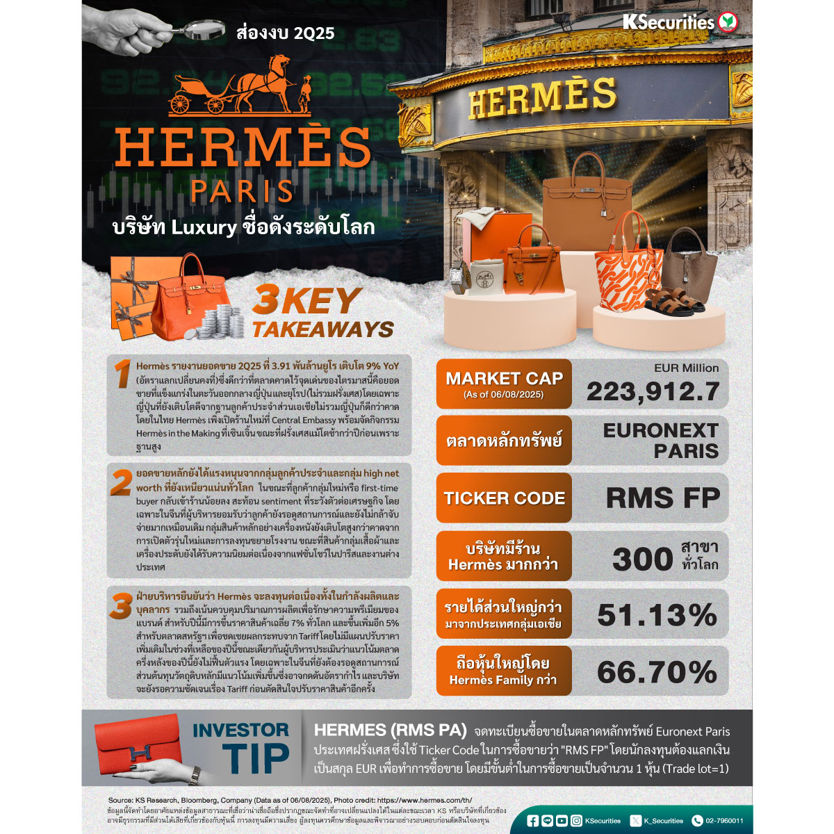 1. Hermès รายงานยอดขาย 2Q25 ที่ 3.91 พันล้านยูโร เติบโต 9% YoY (อัตราแลกเปลี่ยนคงที่)