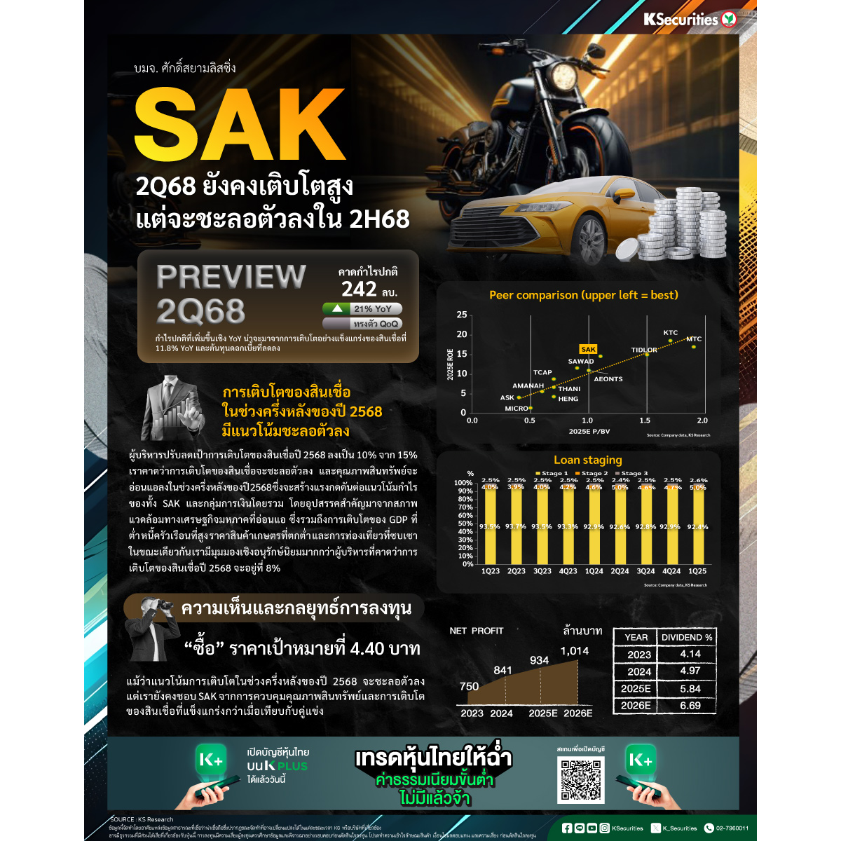 • แนะนำ “ซื้อ” เราคงคำแนะนำ “ซื้อ” SAK และราคาเป้าหมายที่ 4.4 บาท แม้ว่าแนวโน้มการเติบโตในช่วงครึ่งหลังของปี 2568 จะชะลอตัวลง แต่เรายังคงชอบ SAK จากการควบคุมคุณภาพสินทรัพย์และการเติบโตของสินเชื่อที่แข็งแกร่งกว่าเมื่อเทียบกับคู่แข่ง