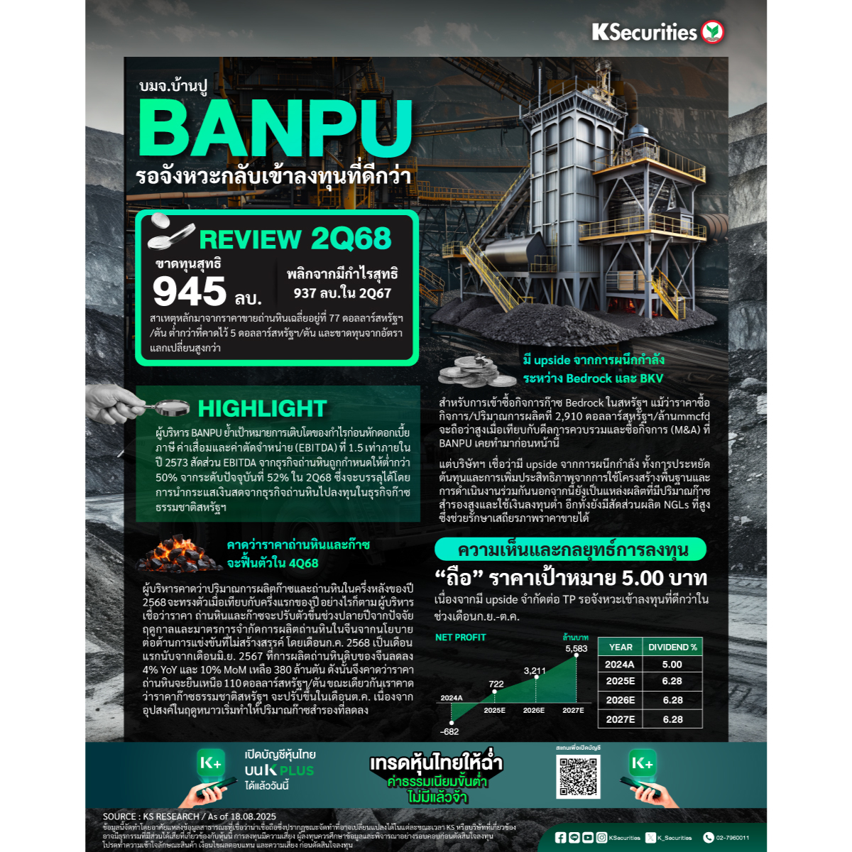 - คาดว่าปริมาณการขายถ่านหินและก๊าซใน 2H68 จะทรงตัว HoH แต่ราคามีแนวโน้มปรับขึ้นในไตรมาส 4/68 จากปัจจัยฤดูกาล อุปสงค์ก๊าซ LNG ในสหรัฐฯที่สูงขึ้น และการจำกัดการผลิตถ่านหินของจีน