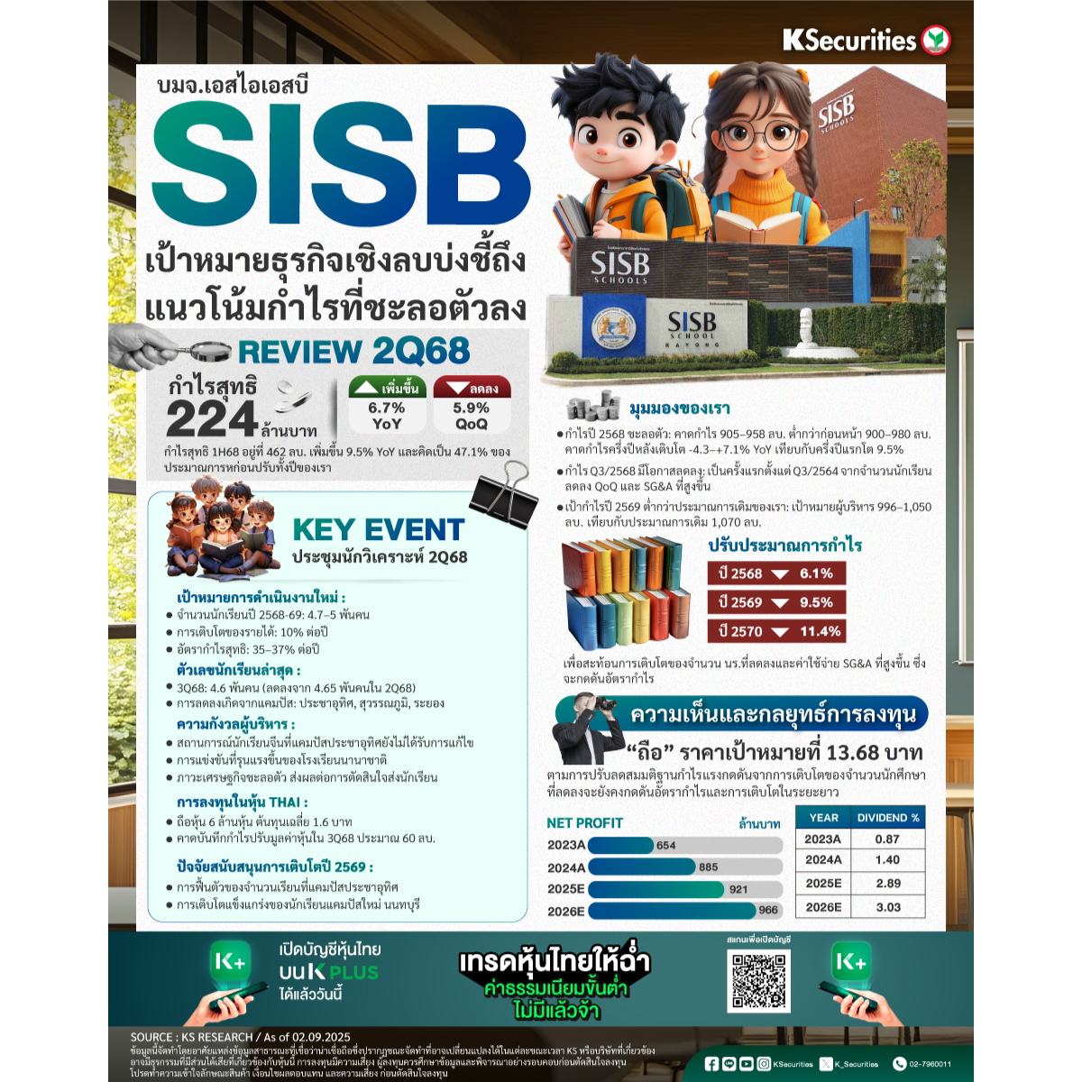 มุมมอง KS : แนะนำ “ถือ” เราคงคำแนะนำ “ถือ” SISB แต่ปรับลดราคาเป้าหมายกลางปี 2569 ลงจากเดิม 15.43 บาท เป็น 13.68 บาท ตามปรับลดประมาณการกำไร เราเชื่อว่าหุ้นยังขาดปัจจัยกระตุ้นในระยะยาว เนื่องจากการเติบโตของจำนวนเรียนในแคมปัสหลักอย่าง ประชาอุทิศและธนบุรีเริ่มลดลง รวมถึงจำนวนเรียนที่ลดลงเล็กน้อยในแคมปัสใหม่อย่าง แคมปัสระยอง ซึ่งเราเชื่อว่าจะยังคงเป็นอุปสรรคต่อการขยายตัวอัตรากำไร