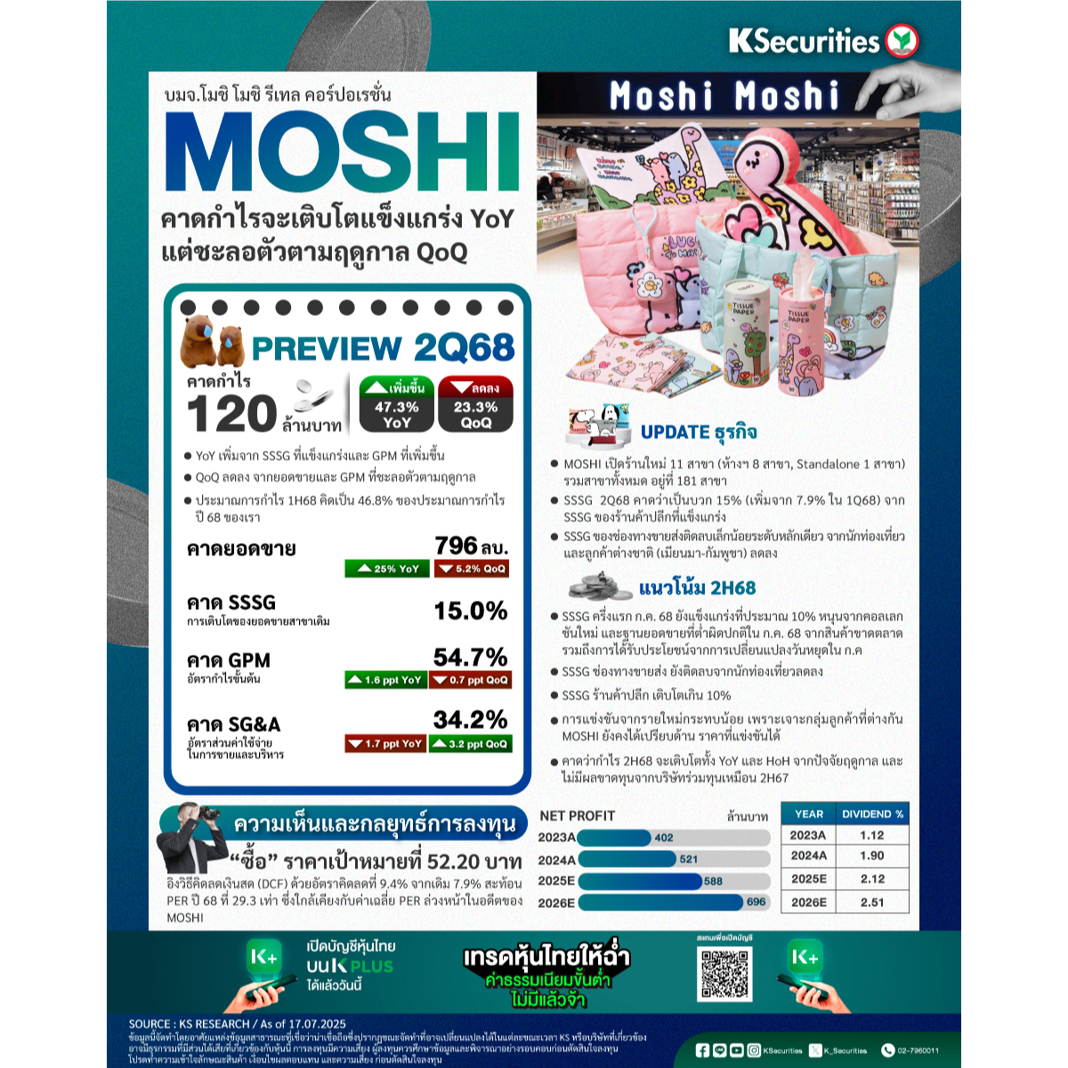 - คาดกำไรของ MOSHI ไตรมาส 2/68 อยู่ที่ 120 ลบ. เพิ่มขึ้น 47.3% YoY จาก SSSG ที่แข็งแกร่งและ GPM ที่เพิ่มขึ้น แต่ลดลง 23.3% QoQ จากยอดขายและ GPM ที่ชะลอตัวตามฤดูกาล