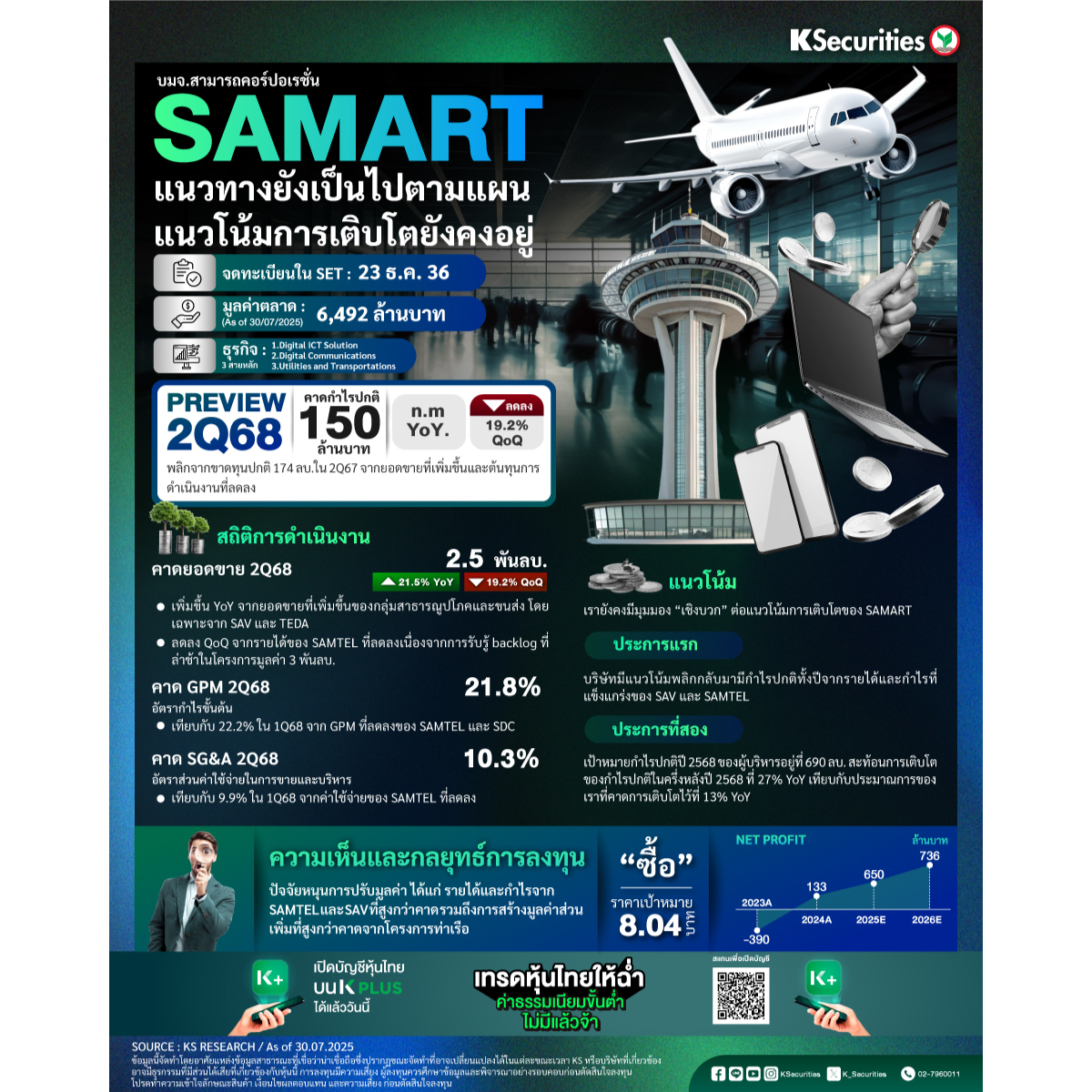• แนวโน้ม เรายังคงมีมุมมองเชิงบวกต่อแนวโน้มการเติบโตของ SAMART ประการแรก บริษัทมีแนวโน้มพลิกกลับมามีกำไรปกติทั้งปีจากรายได้และกำไรที่แข็งแกร่งของ SAV และ SAMTEL ประการที่สอง เป้าหมายกำไรปกติปี 2568 ของผู้บริหารอยู่ที่ 690 ลบ. สะท้อนการเติบโตของกำไรปกติในครึ่งหลังปี 2568 ที่ 27% YoY เทียบกับประมาณการของเราที่คาดการเติบโตไว้ที่ 13% YoY