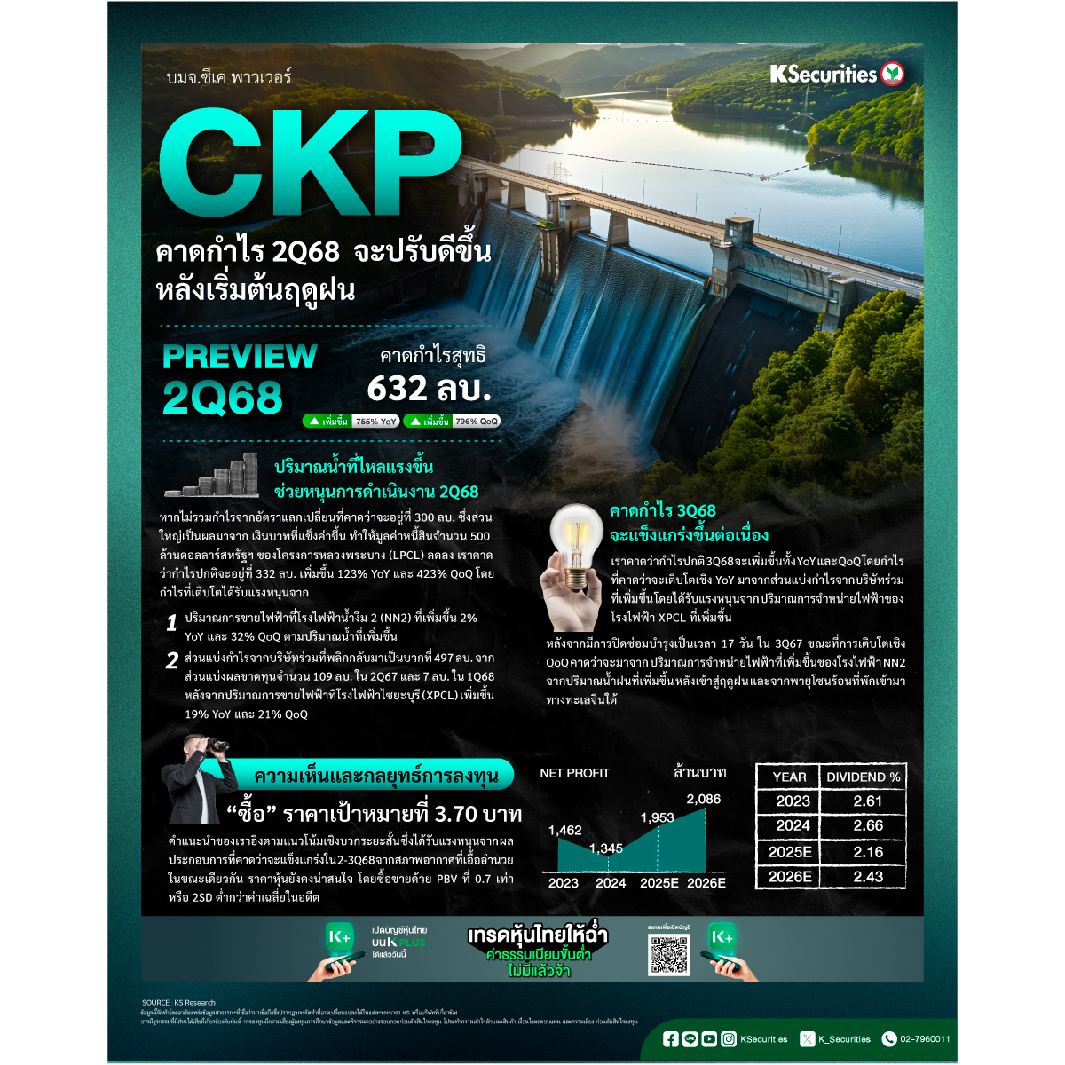 - CKP จะรายงานผลประกอบการไตรมาส 2/2568 โดยคาดว่ากำไรกำไรสุทธิจะอยู่ที่ 632 ลบ. เพิ่มขึ้น 755% YoY และ 796% QoQ