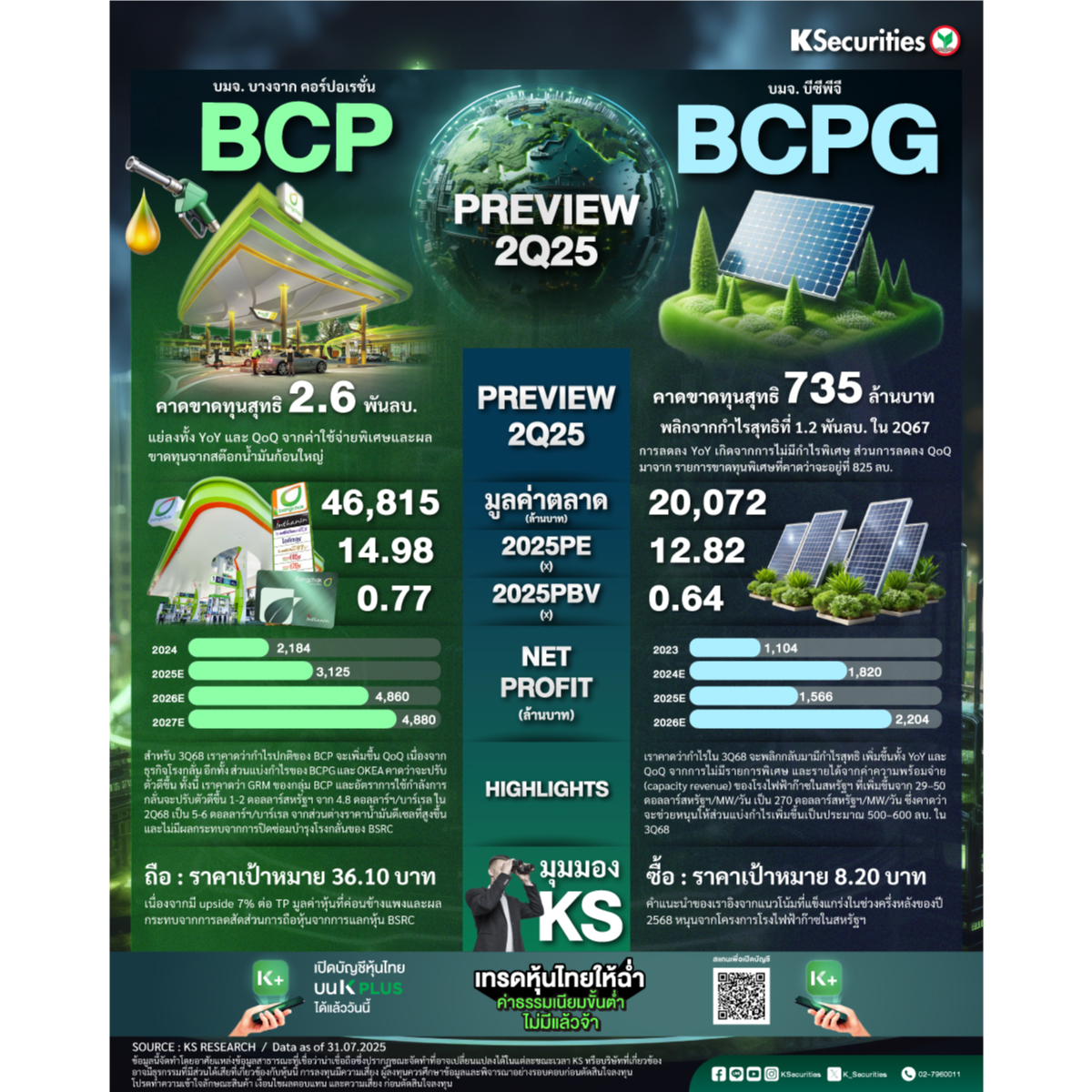 - คาดผลขาดทุนสุทธิไตรมาส 2/68 จะอยู่ที่ 2.6 พันลบ. แย่ลงทั้ง YoY และ QoQ จากค่าใช้จ่ายพิเศษและผลขาดทุนจากสต๊อกน้ำมันก้อนใหญ่ นอกจากนี้ กำไรปกติจะลดลง QoQ จากอัตราการใช้กำลังกลั่นของ BSCR ที่ลดลง และกำไรของ OKEA และ BCPG ที่ลดลง