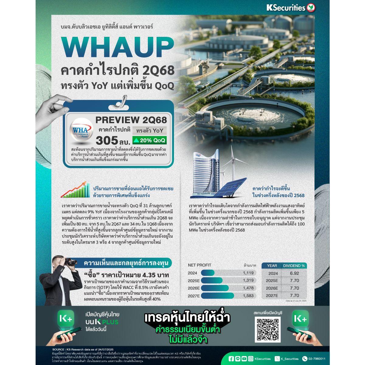 WHAUP คาดกำไรปกติ 2Q68 ทรงตัว YoY แต่เพิ่มขึ้น QoQ