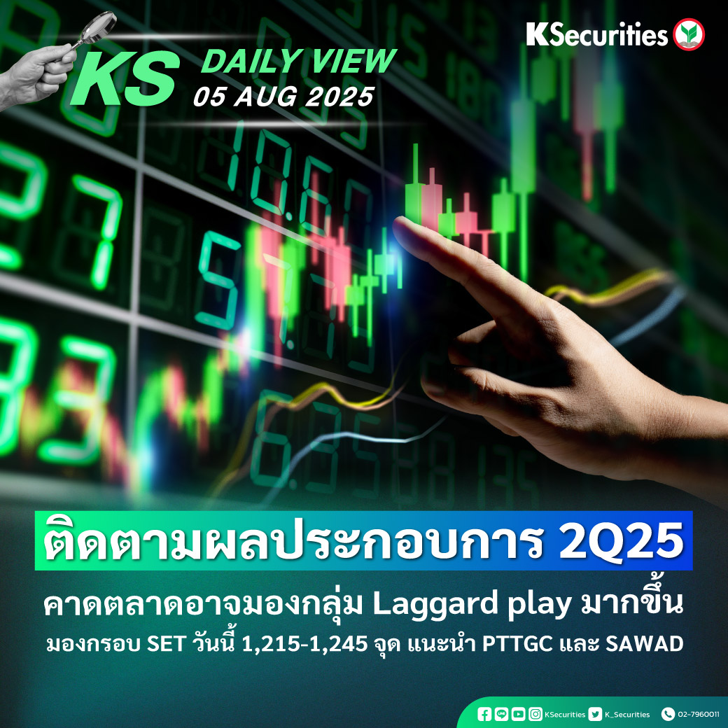 KS Daily View 05.08.2025 >>> ติดตามผลประกอบการ 2Q25 คาดตลาดอาจมองกลุ่ม Laggard play มากขึ้น มองกรอบ SET วันนี้ 1,215-1,245 จุด แนะนำ PTTGC และ SAWAD