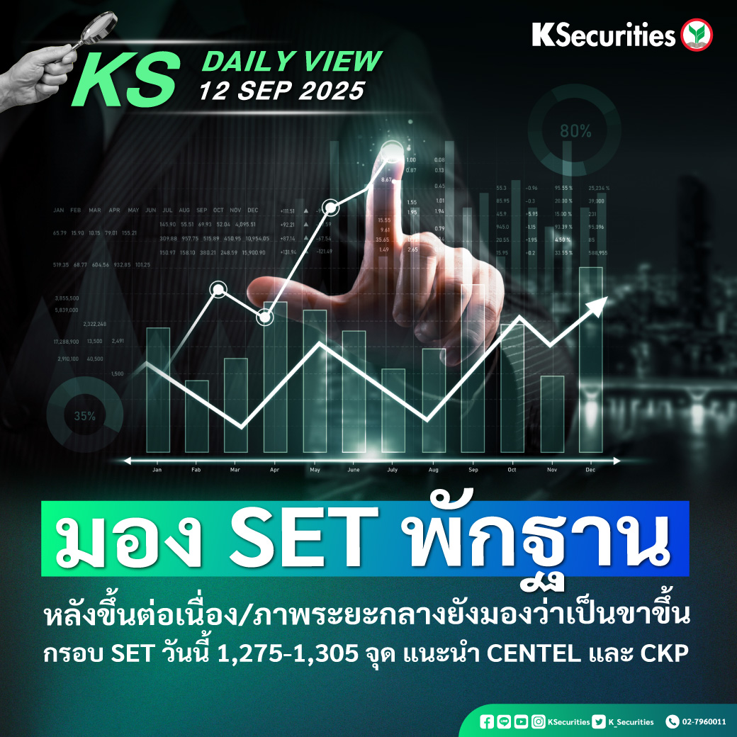 KS Daily View 12.09.2025 >>> มอง SET พักฐาน หลังขึ้นต่อเนื่อง/ภาพระยะกลางยังมองว่าเป็นขาขึ้น กรอบ SET วันนี้ 1,275-1,305 จุด แนะนำ CENTEL และ CKP