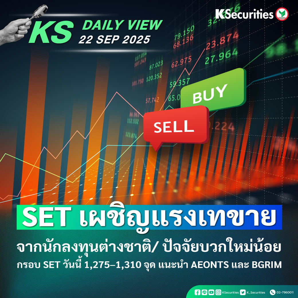 KS Daily View 22.09.2025 >>> SET เผชิญแรงเทขายจากนักลงทุนต่างชาติ/ ปัจจัยบวกใหม่น้อยกรอบ SET วันนี้ 1,275–1,310 จุด แนะนำ AEONTS และ BGRIM