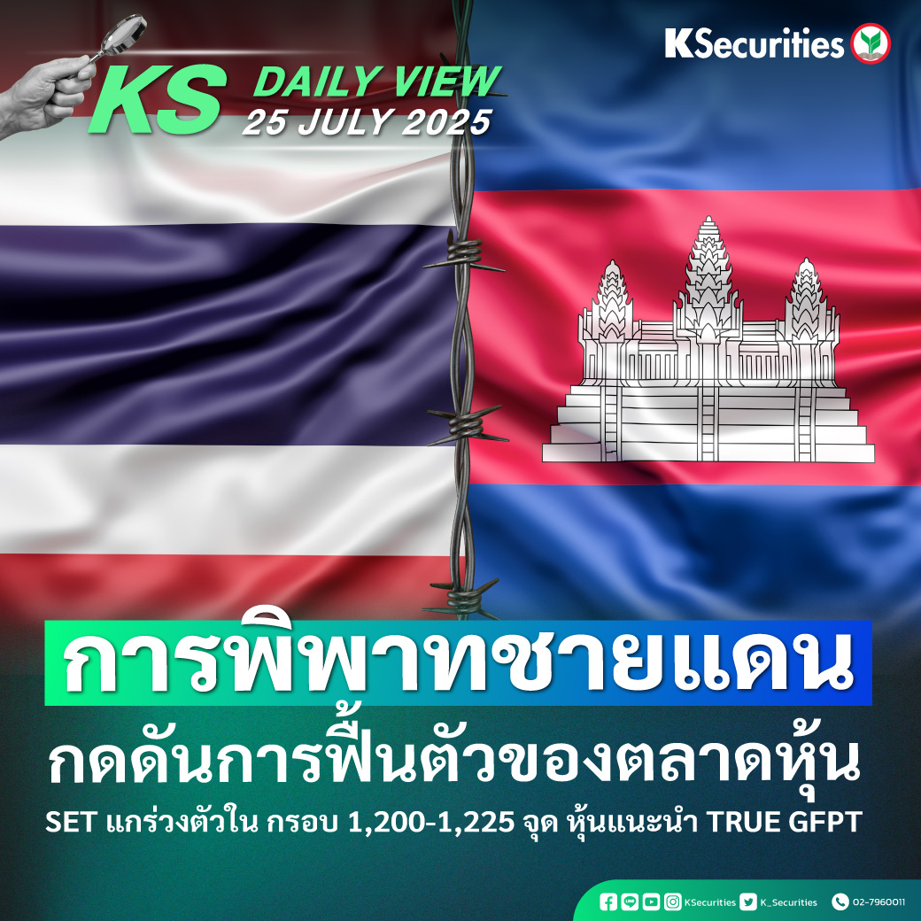 KS Daily View 25 ก.ค. 2025>>> คาด SET Index ของไทยแกว่งตัว sideway ในกรอบ 1,200-1,225 จุด จากแรงกกดันของการพิพาท ณ ชายแดนของไทย และ ตลาดหุ้นไทยปรับตัวขึ้นในช่วงต้นสัปดาห์ที่ผ่านมาได้สะท้อนความคาดหวังของการเจรจาการค้าไทยไปแล้วบางส่วนแนะนำ TRUE GFPT