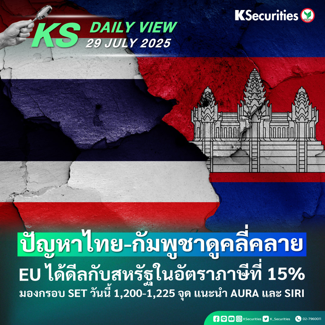 KS Daily View 29.07.2025 >>> ปัญหาไทย-กัมพูชาดูคลี่คลาย EU ได้ดีลกับสหรัฐในอัตราภาษีที่ 15% มองกรอบ SET วันนี้ 1,200-1,225 จุด แนะนำ AURA และ SIRI