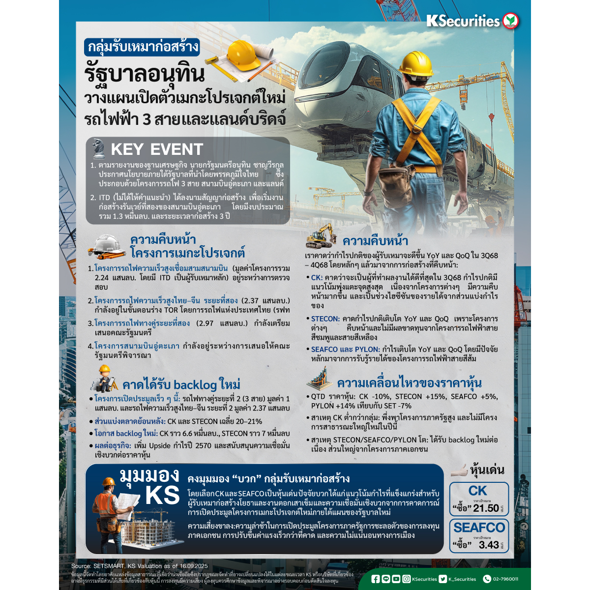 เรายังคงมุมมองเชิงบวกต่อกลุ่มบริการก่อสร้าง โดยเลือก CK (“ซื้อ” ราคาเป้าหมาย 21.5 บาท) และ SEAFCO (“ซื้อ” ราคาเป้าหมาย 3.43 บาท) เป็นหุ้นเด่น ปัจจัยบวก ได้แก่ แนวโน้มกำไรที่แข็งแกร่งสำหรับผู้รับเหมาก่อสร้างโยธาและงานตอกเสาเข็ม และความเชื่อมั่นเชิงบวกจากการคาดการณ์การเปิดประมูลโครงการเมกะโปรเจกต์ใหม่ภายใต้แผนของรัฐบาลใหม่