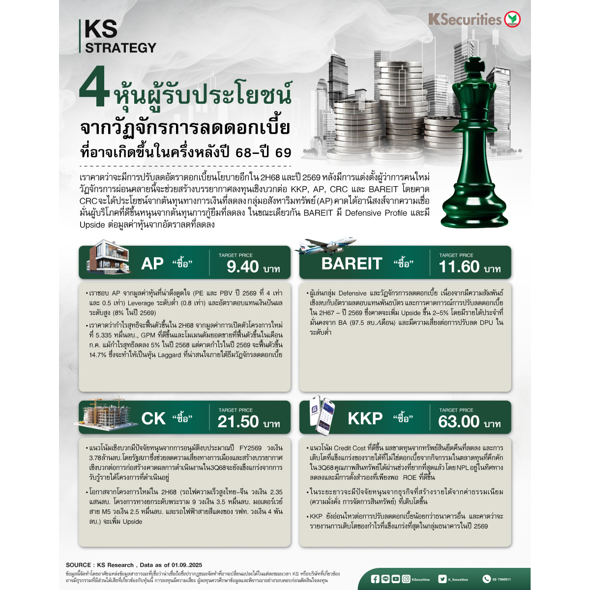 KS Strategy : 4 หุ้นผู้ได้รับประโยชน์จากวัฏจักรการลดดอกเบี้ยที่อาจเกิดขึ้นในครึ่งหลังปี 2568- ปี 2569